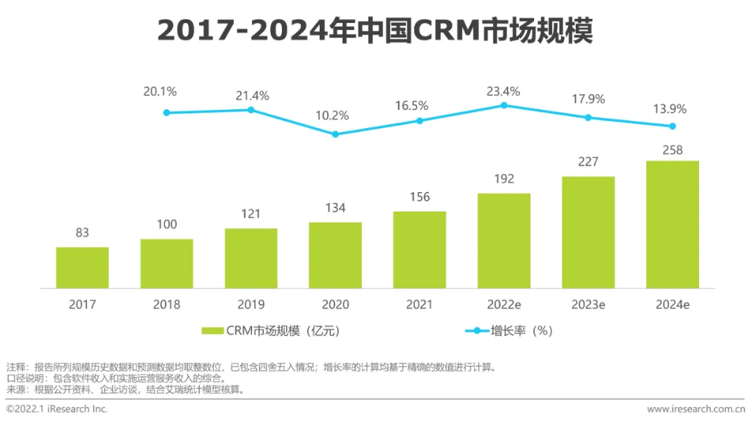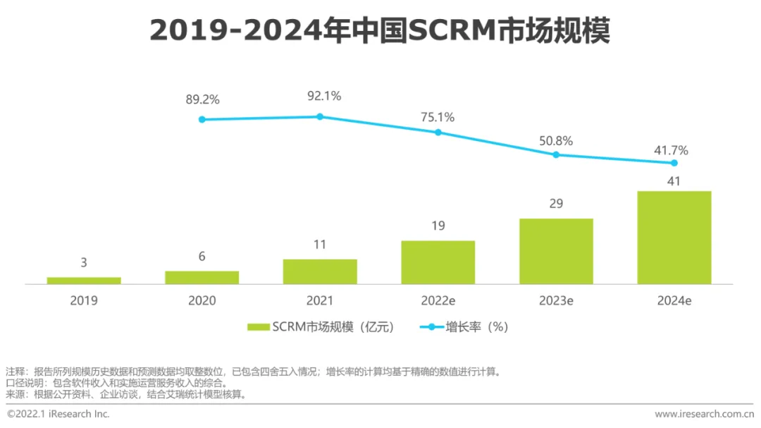 最先在SCRM场景爆发,拉动整体CRM市场创新增长企业微信与微信互联互通,可以流畅地触达12.6亿用户(截至2021Q3),且以一种体验更好的方式对客户进行服务——客户无需离开其熟悉的操作界面即可享受官方、专业、持续的服务。同时,除了触达和沟通外,企业微信还为企业提供了客户运营的操作台。企微可以直接留存最真实的客户服务全生命周期数据,沉淀高质客户数据资产,以数据驱动营销销售活动,从而实现更高转化、低成本的商业增长。企微+SCRM的模式快速在企业侧落地,取代了以往的微信群运营。基于该场景的初创企业数量在近三年爆发式增长,传统厂商也开始发力,整体SCRM市场2021年规模达11亿,增长率达92.1%。SCRM的爆发增长进一步带动了CRM的创新迭代,2021年CRM市场规模达到了156亿元。