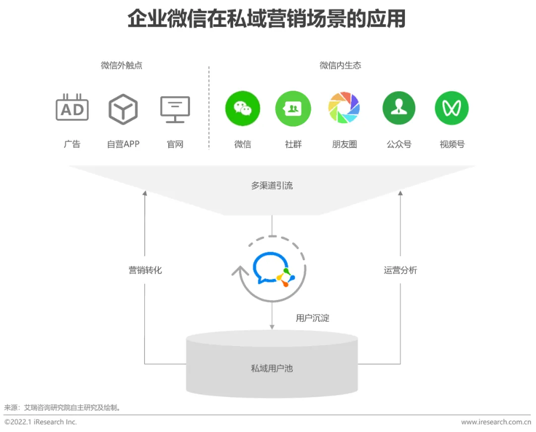 私域营销的最佳载体,链接+沉淀实现客户全生命周期运营在公域平台获客成本高企的背景下,私域渠道加速增长。继公众号、小程序后,腾讯推出了私域的又一新载体——企业微信。企微具备「前端流量链接+后端客户运营」的双向价值,是私域营销的最佳载体。向前,企微可以与微信打通,触达微信12.6亿用户,以无侵入感的方式与客户建立紧密联系;向后,企微可以将来自多渠道的用户收拢,形成私域用户池,再利用数字化手段,赋能客户价值提升。基于企业微信,企业可以创新更多社交裂变私域玩法,提升服务质量,改善客户体验,建立以客户为中心的运营体系,实现商业增长。