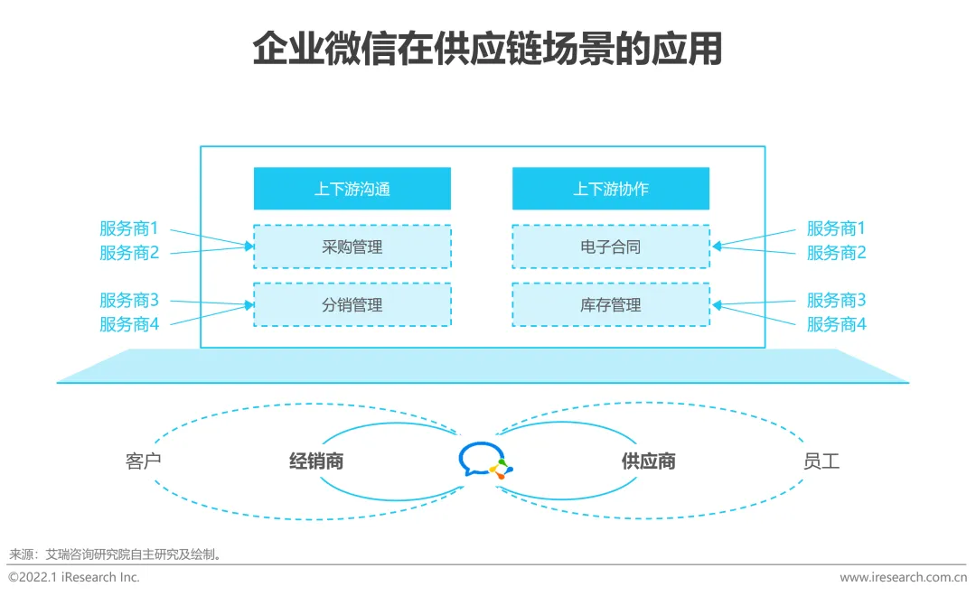 企业微信一方面与工具类协同办公软件类似,可以为企业内部员工提供流畅的数字化办公体验,提升办公效率;另一方面,基于广泛的企微生态,企业微信B2B连接的价值也在逐步释放。在企微平台上,厂商与上下游之间、厂商与厂商之间可以实现跨组织的协同,真正打通供应链端到端的流程,进而实现效率的飞跃式提升。2022年1月10日,企业微信在4.0版本中上线了“上下游”模块,正式开启了B2B场景的探索。未来,预计B2B的供应链管理场景将会与B2C的SCRM场景一同快速发展,为产业互联网带来更多的模式创新和更大的想象空间。