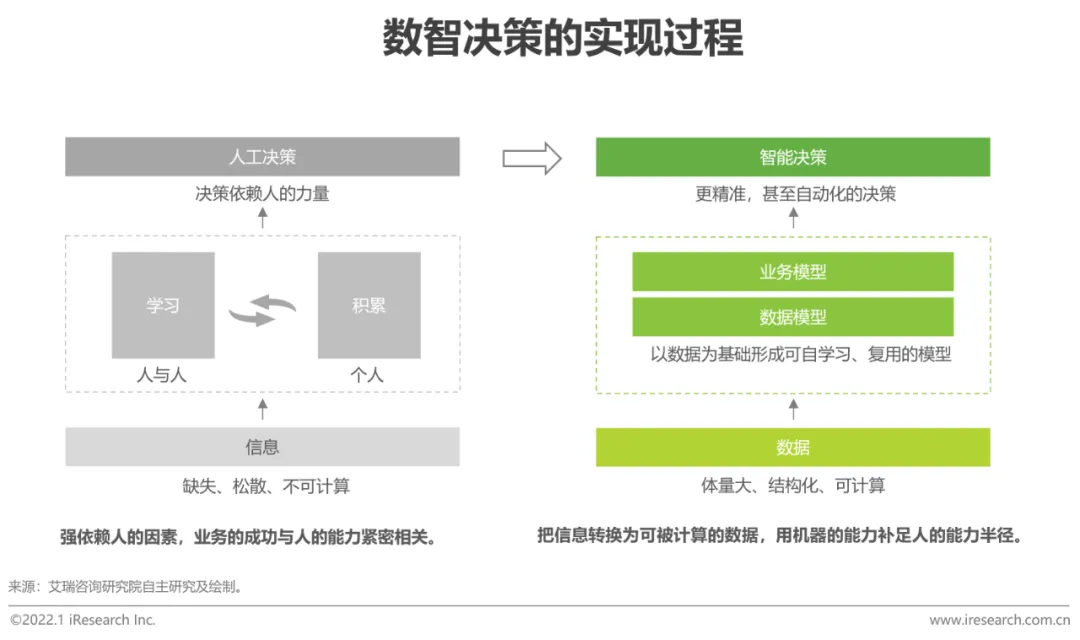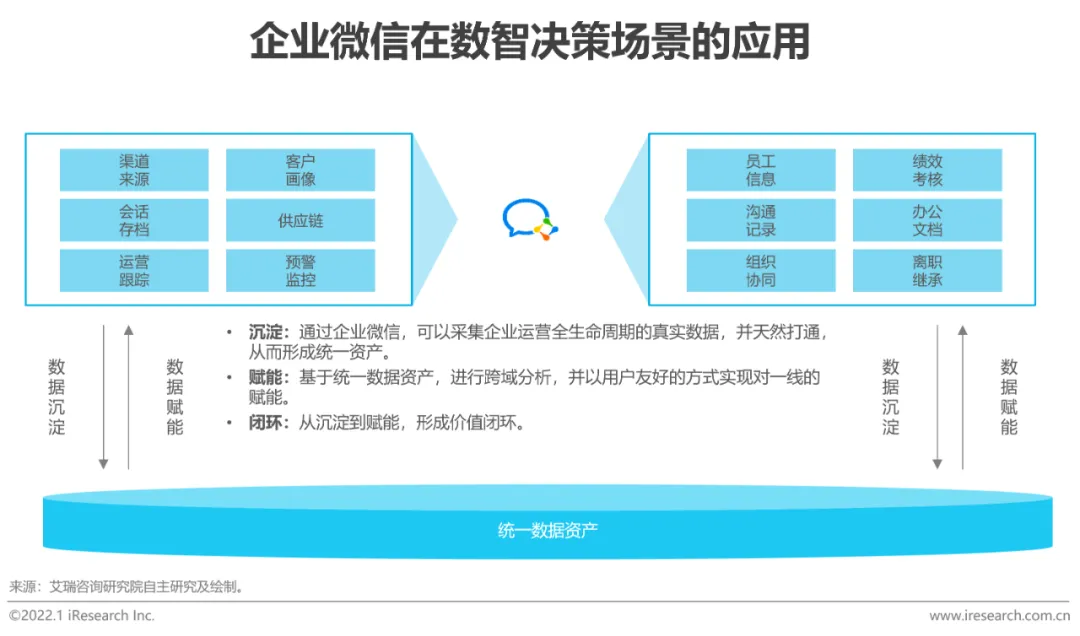 建立高质数据资产,支持实时赋能一线,形成数据价值闭环从数智决策的实现过程来看,影响企业向数据驱动转型的卡点往往存在于链条的两端:一前——跨部门、跨系统数据难以打通,一线真实数据难以获得,导致数据资产建设难、质量差;一后——员工使用不方便,特别在实时性方面体验差,导致对一线业务赋能价值的折损。以企业微信为中枢,企业一方面可以无缝地将真实运营数据沉淀下来,另一方面可以直接在员工工作界面(对话框等)进行赋能,“沉淀⇄赋能”双向互动,天然形成了数据和价值的闭环。