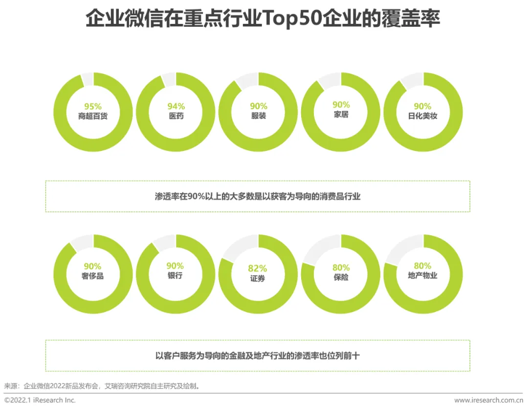 基于企业微信“连接器”的产品属性,企业微信广泛应用于以获客和以服务为导向的行业中。企业微信内置的客户联系、客户群、微信客服等功能,以及与腾讯系其他产品的联动,不仅助力企业实现B2C的广触达,同时也为企业与消费者之间的双向沟通关系构建了桥梁,通过精细化运营与客户建立长期信任关系以沉淀高粘性客户。企业微信2022年新品发布会中公布的数据显示,目前企微在消费品(商超百货、服装、日化美妆、奢侈品等)、医药、家居、金融(银行、证券、保险等)、地产物业等行业的渗透率较高,均达到80%以上。