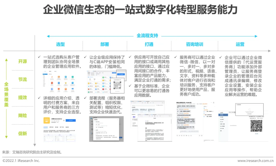 企业微信平台聚合了多种类型的软件开发商,其第三方应用市场覆盖支持企业数字化转型多元场景的APP,包括SCRM、CRM、OA、财务管理、HRSaaS、采购、电子签、企业培训软件等,可以满足企业开源、节流、提效、降险和促新的多种诉求。对于数字化能力缺失的中小微企业而言,企业微信平台可以提供一站式的最佳实践。同时,基于企业微信特有的连接和开放能力,企业还可以获得从选型,到部署、打通,到咨询培训、运营的全流程支持。