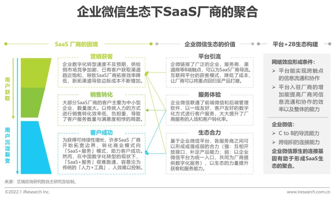 随着企业对SaaS模式接受度的提升,其应用场景正在从边缘辅助向核心业务渗透,SaaS在企业数字化转型中的重要性不断提升。然而,就现阶段市场发展来看,SaaS厂商在获客成本、续约率、市场竞争、商业模式探索、人效平衡等方面还存在较多的困境。企业微信以其“连接、聚合、协同”的优势,为SaaS厂商提供了生态聚合的平台。基于企微生态,厂商之间可以形成网络效应,“各美其美,美人之美,美美与共”的产业互联蓝图成为可能。