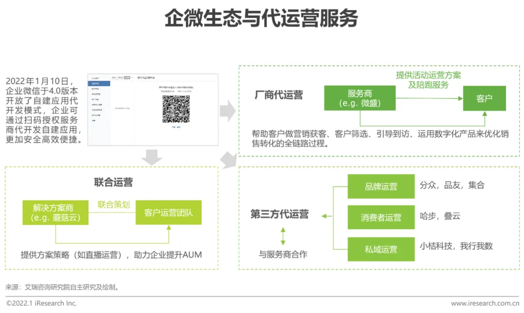 从需求端来看,现阶段中小微企业对于数字化转型的思考和执行能力还并未成熟,且企业微信玩法还较为新颖,需要外部厂商在咨询、开发、运营的一些具体问题上给予其助力。从供给端来看,企业微信平台上的生态合作伙伴主要由SaaS厂商和初创厂商构成,受限于商业模式和内部运营机制,往往难以满足客户陪跑的诉求。供需的不匹配催生了基于企微开发商和企业之间新的代开发、代运营市场。