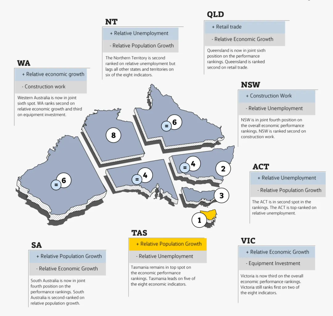CommSec的澳洲州际报告及其排名主要参考了8个重要指标:经济增长、零售消费、基础设施和设备投资、失业率、建筑工程、人口增长、住宅信贷和新屋开建率。