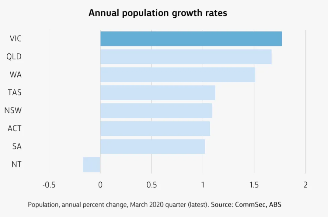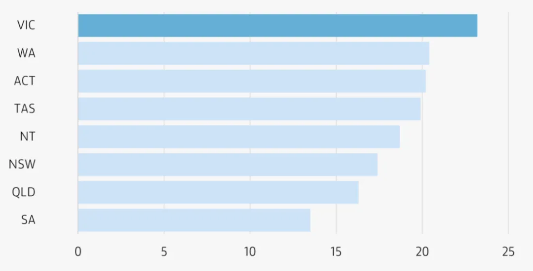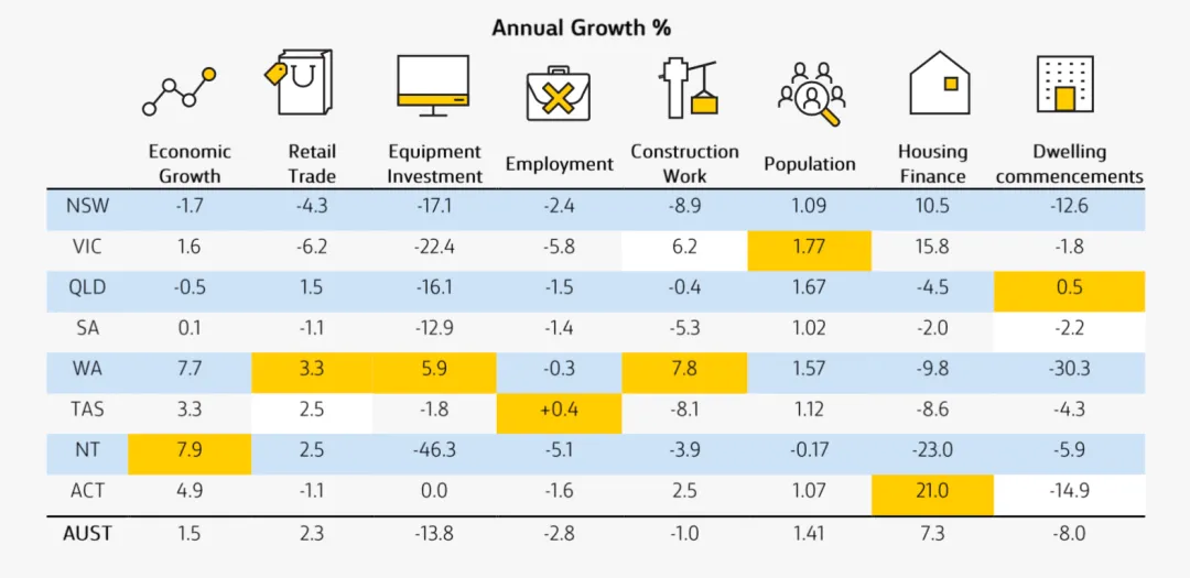 经济增长:在全澳八个州和领地中,西澳州在经济增长这一指标中表现抢眼,在全澳排名第二,仅次于维多利亚州。从中也可以看出维州的强劲表现,在如此疫情严重的打击下,还能保住全澳经济增长老大哥的位置。