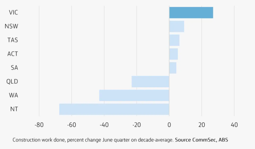 建筑工程:最后,西澳州的建筑工程指数拉了大腿,位列全澳倒数第二,暴跌超过60%,说明西澳州房屋在建并不多,而疫情爆发的维多利亚州在建工程反而增加了近百分之30,位列全澳第一。