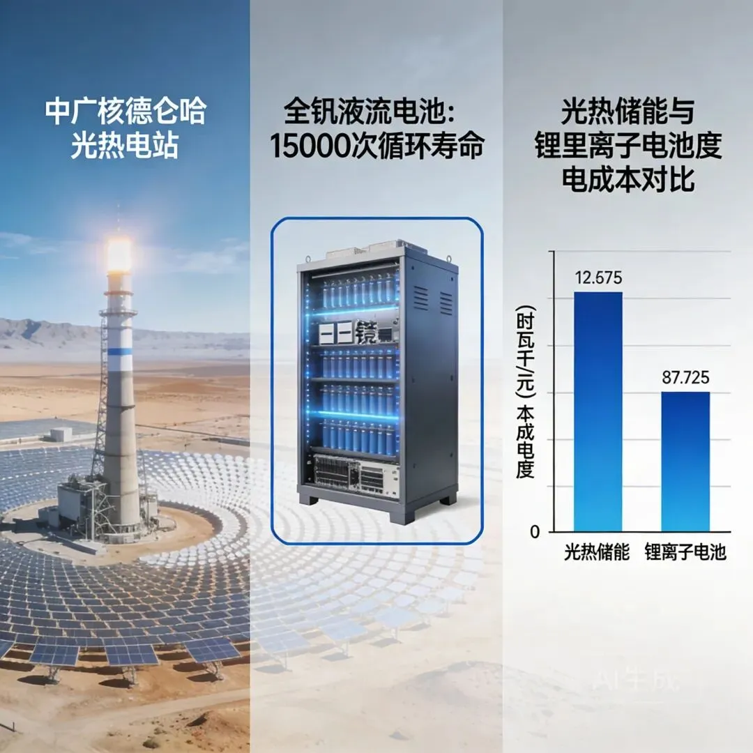 技术维度:经过 "十三五" 至 "十四五" 期间的示范工程验证,国内光热发电技术已实现从跟跑到并跑的跨越。中广核德令哈 50MW 槽式光热电站连续稳定运行超 36 个月,年等效利用小时数达 4300 小时,较国际同类项目高出 8%。储能系统方面,全钒液流电池循环寿命突破 15000 次,度电成本降至 0.35 元,较锂离子电池具备明显长时优势。