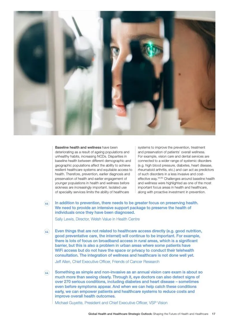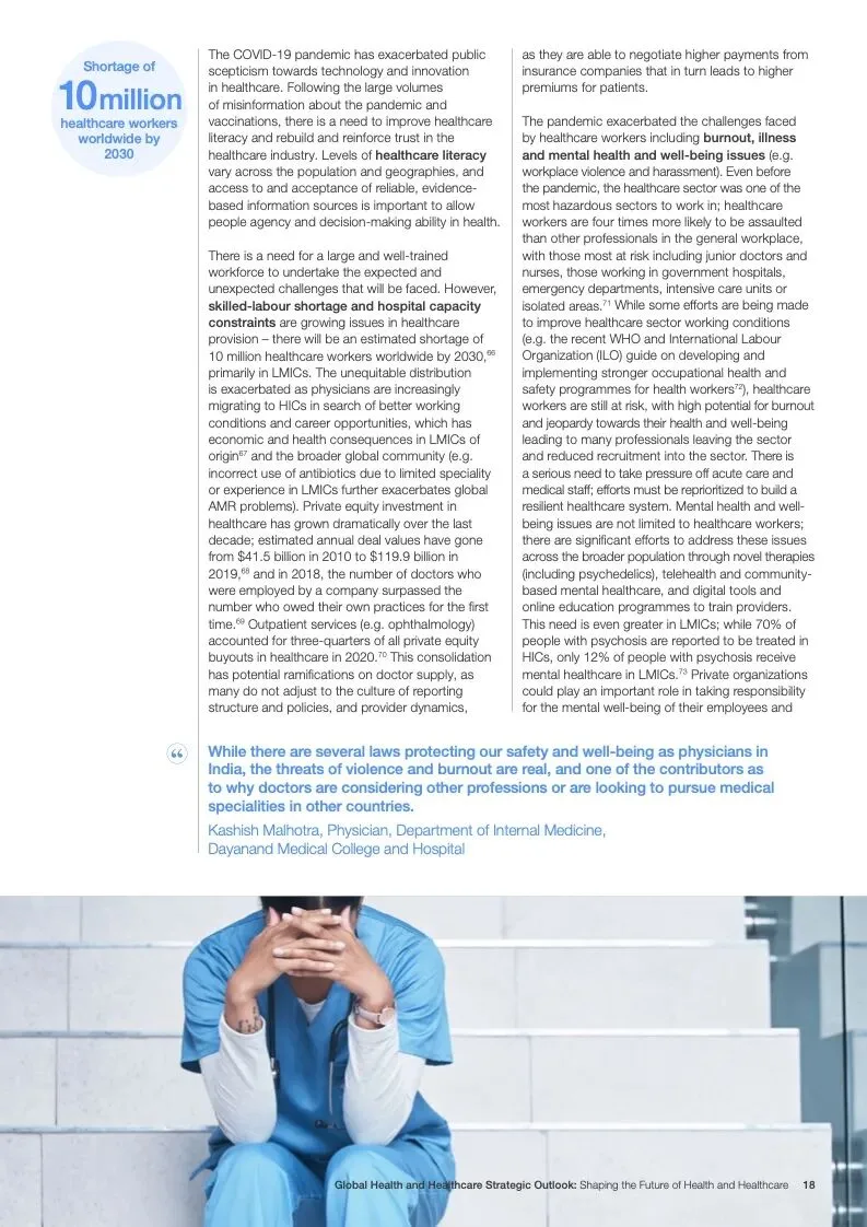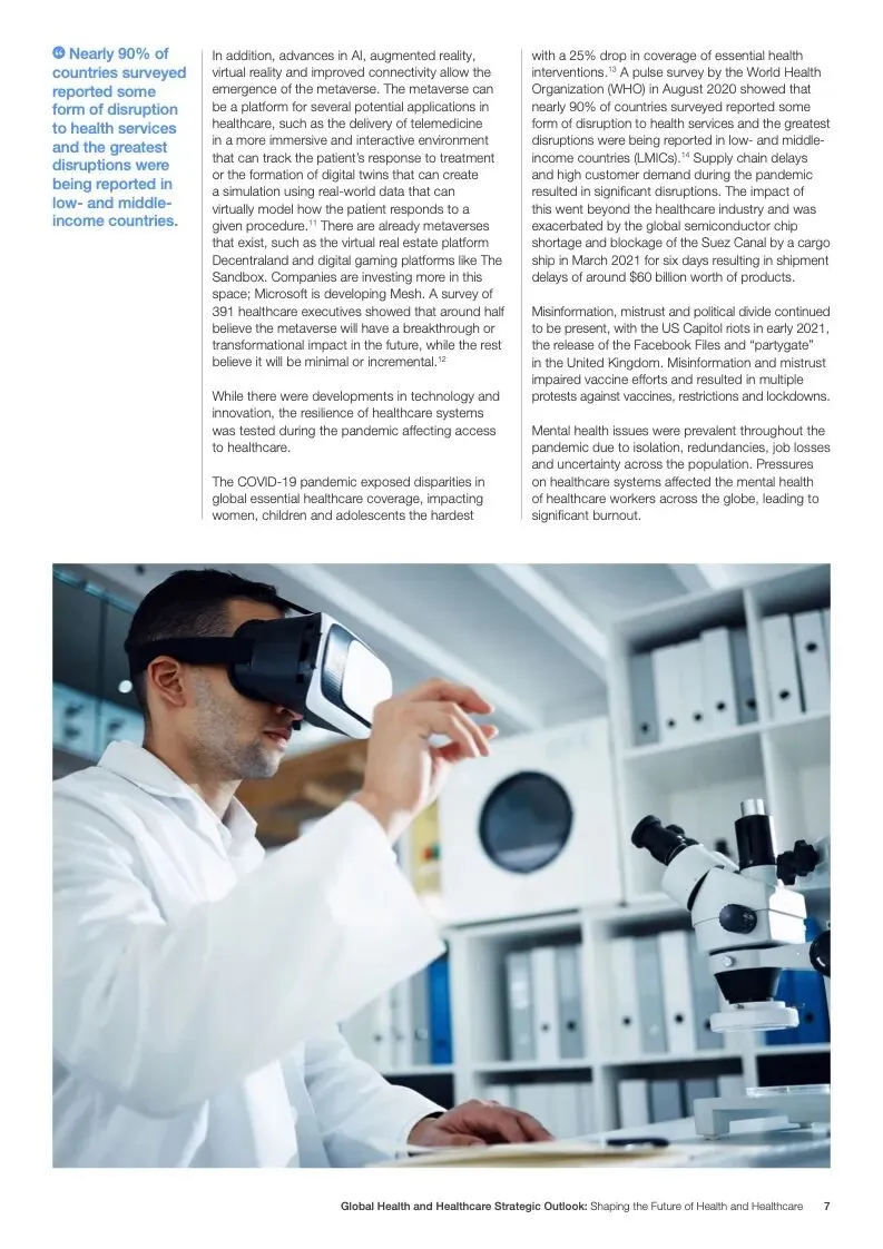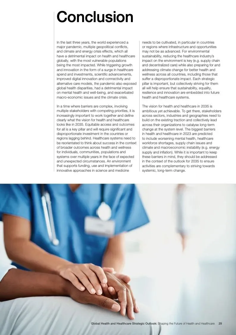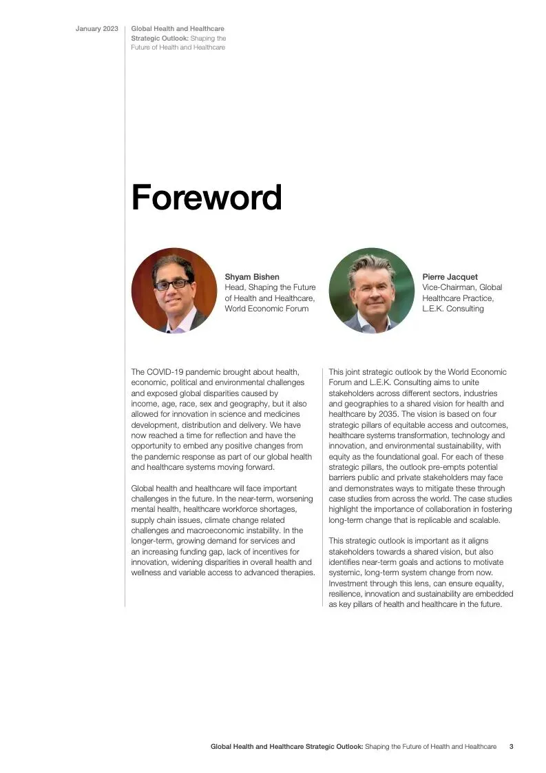 世界经济论坛发布了新报告“2023年全球健康和医疗保健战略前景”。面对过去几年的挑战,世界在与卫生有关的可持续发展目标方面偏离了轨道。大流行造成前所未有的破坏,随之而来的是社会、经济、地缘政治和环境挑战,继续对人类健康构成复杂且相互关联的威胁,特别是对弱势群体的影响,以及卫生保健工作者和基本卫生产品供应的压力。重要的是要确保利益攸关方、行业、国家和行业努力实现共同的健康和医疗保健目标,并为此开展合作。