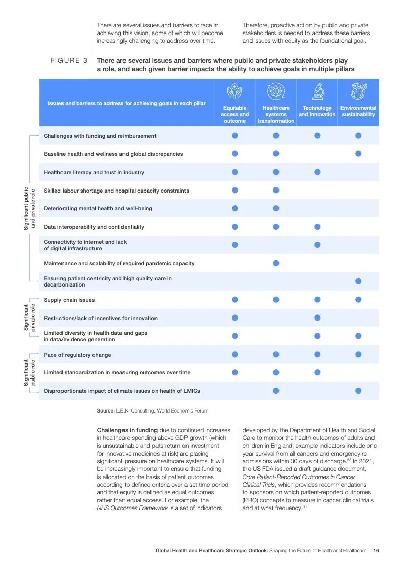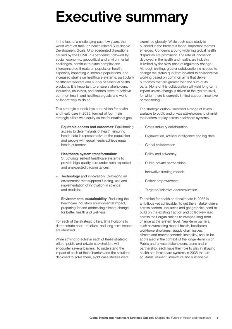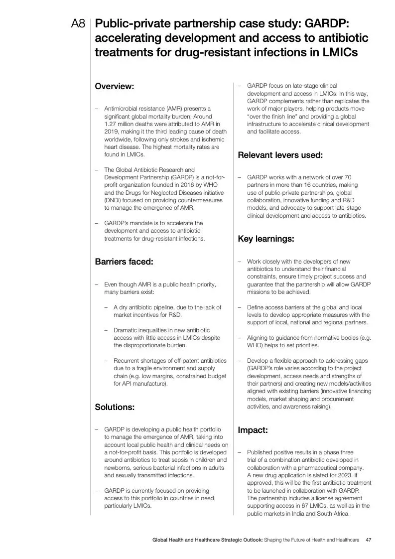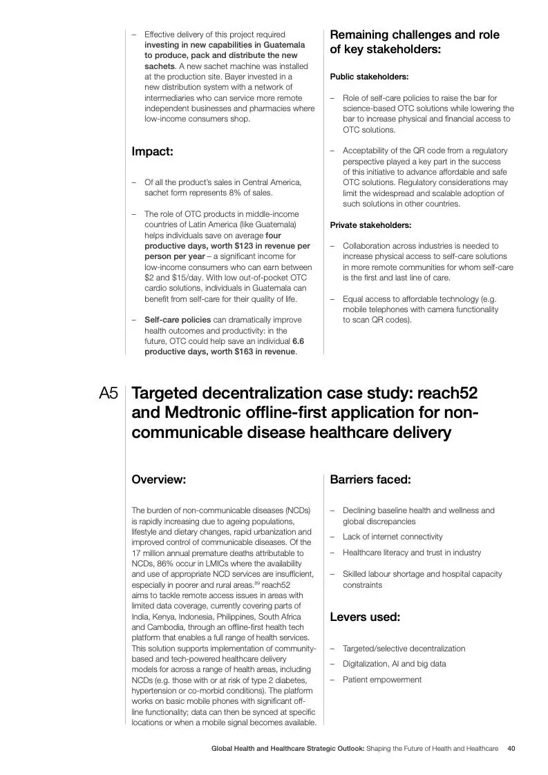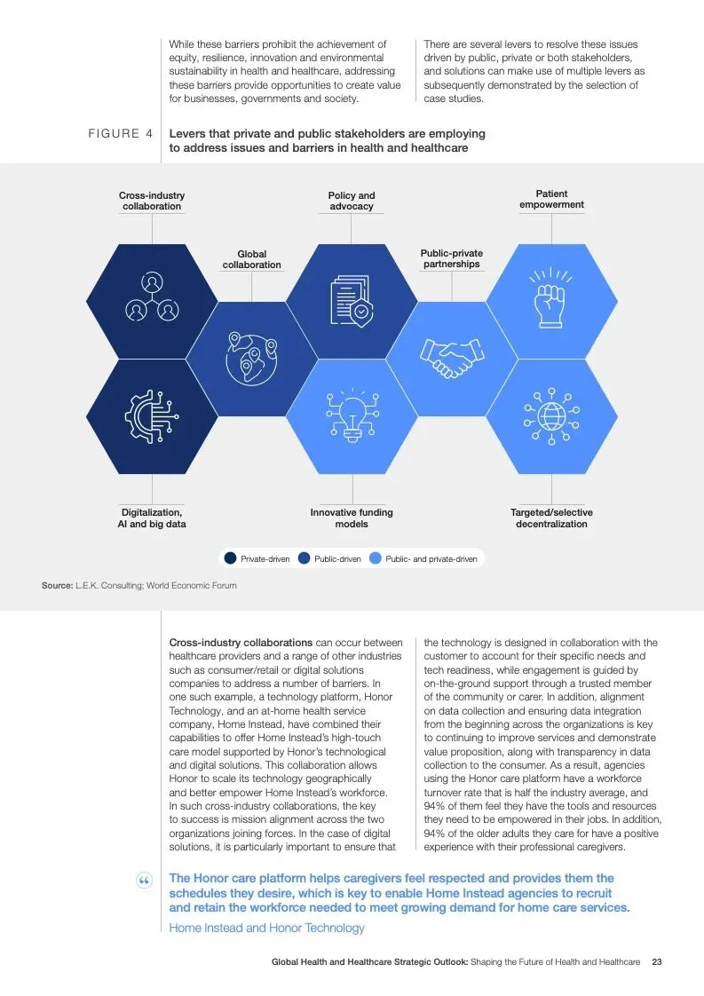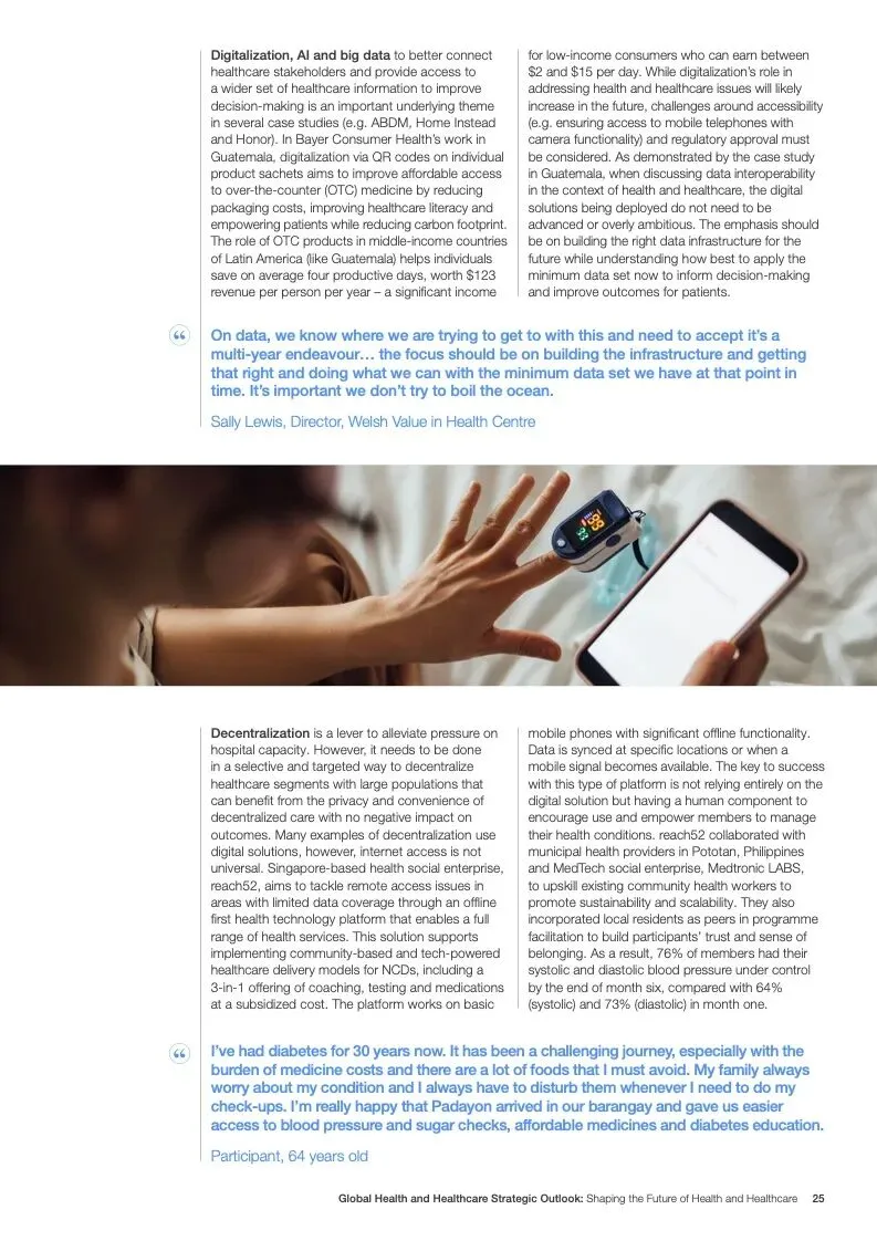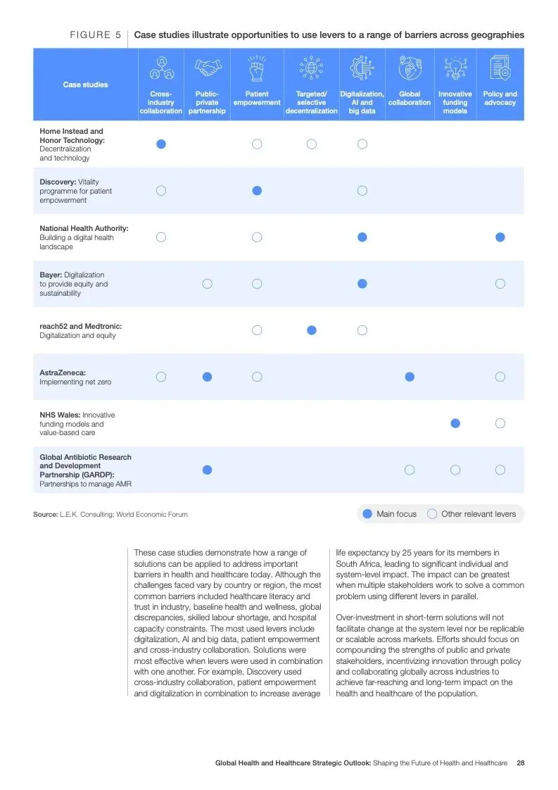 在努力实现这些战略的同时,公共和私营利益攸关方将遇到一些障碍。为了了解这些障碍的影响以及为解决这些障碍而部署的解决方案,报告对全球八个案例进行了研究。虽然每个案例研究都面临着微妙的障碍。对全球健康差距扩大的担忧十分突出。健康和医疗保健行业的创新速度受到监管改革步伐缓慢的限制。虽然在转变,但需要更大的协作来改变现状,从孤立的工作到基于共同目标的协作,这些共同目标提供的结果大于其各部分的总和。这些合作都不会产生长期的影响,除非在系统级别上驱动变化,而目前对系统级别的支持、激励或监控是有限的。
