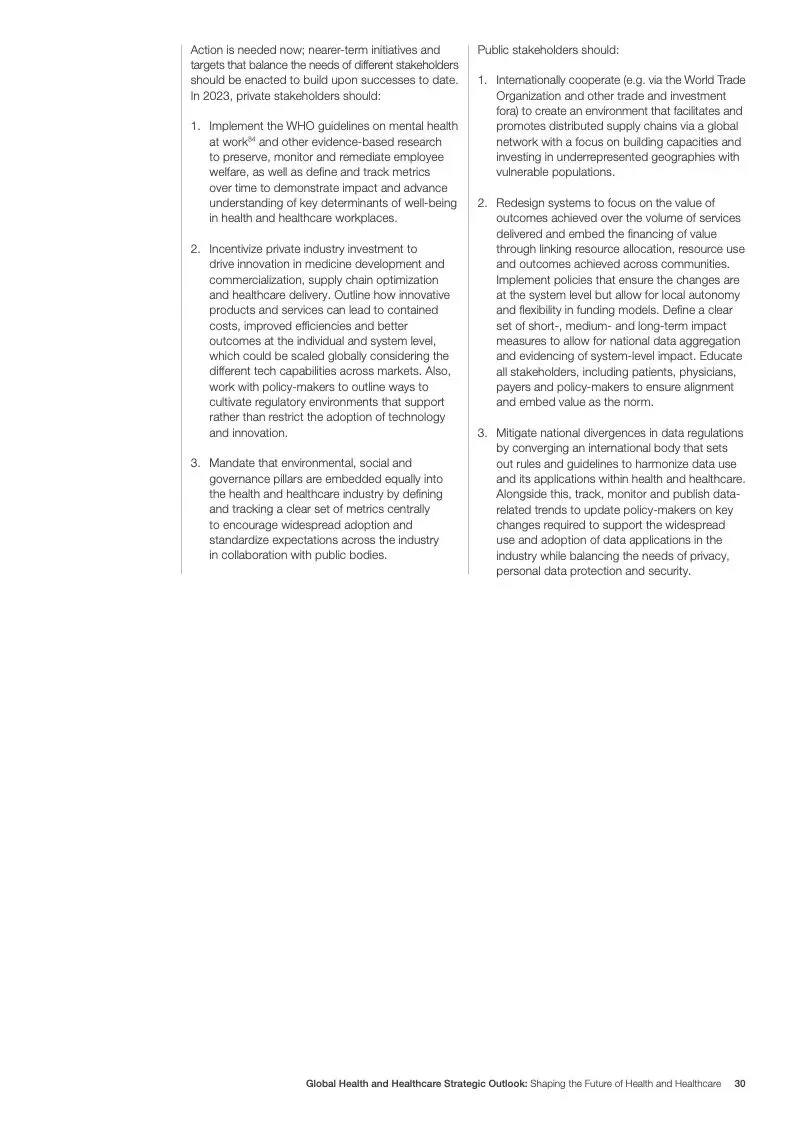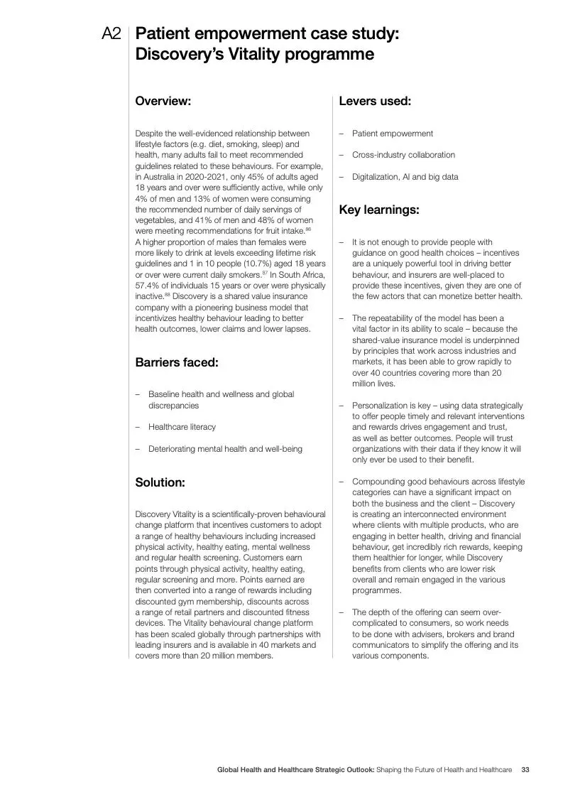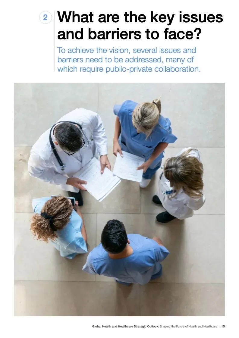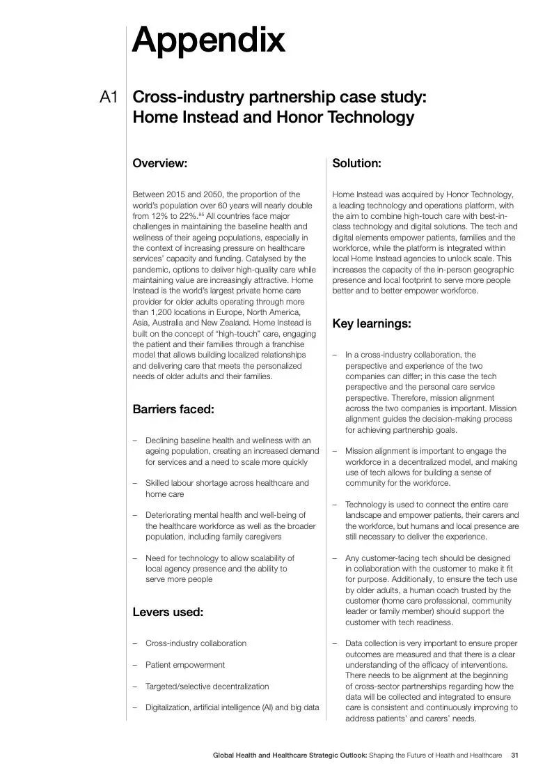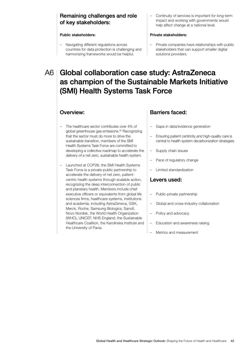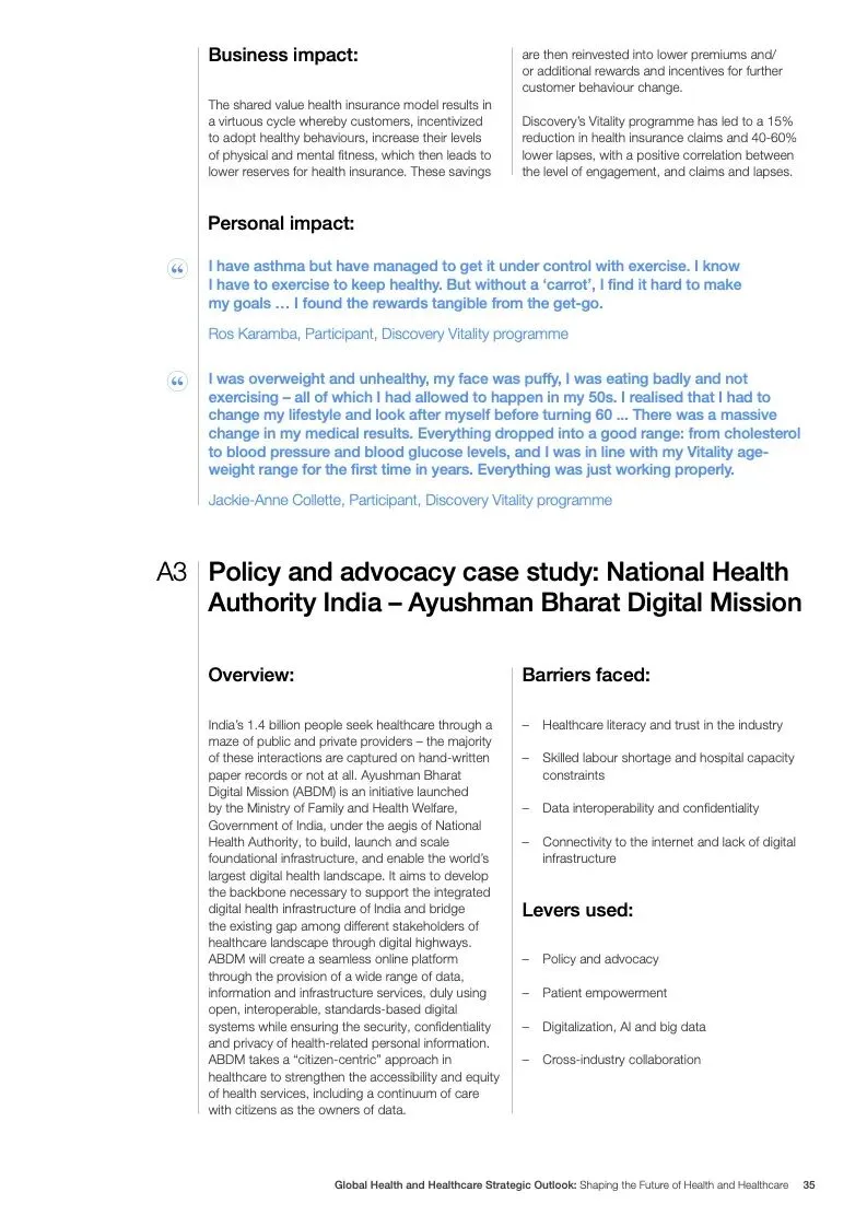 在努力实现这些战略的同时,公共和私营利益攸关方将遇到一些障碍。为了了解这些障碍的影响以及为解决这些障碍而部署的解决方案,报告对全球八个案例进行了研究。虽然每个案例研究都面临着微妙的障碍。对全球健康差距扩大的担忧十分突出。健康和医疗保健行业的创新速度受到监管改革步伐缓慢的限制。虽然在转变,但需要更大的协作来改变现状,从孤立的工作到基于共同目标的协作,这些共同目标提供的结果大于其各部分的总和。这些合作都不会产生长期的影响,除非在系统级别上驱动变化,而目前对系统级别的支持、激励或监控是有限的。