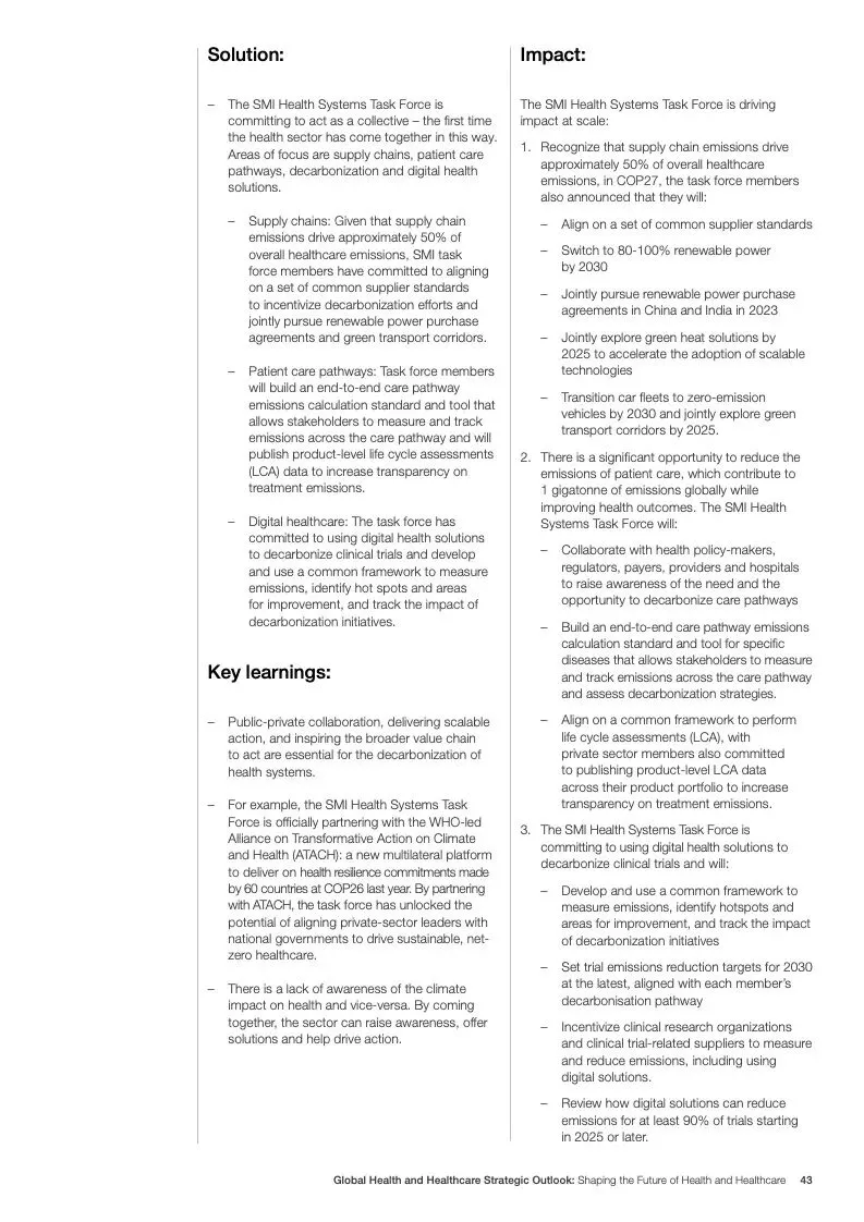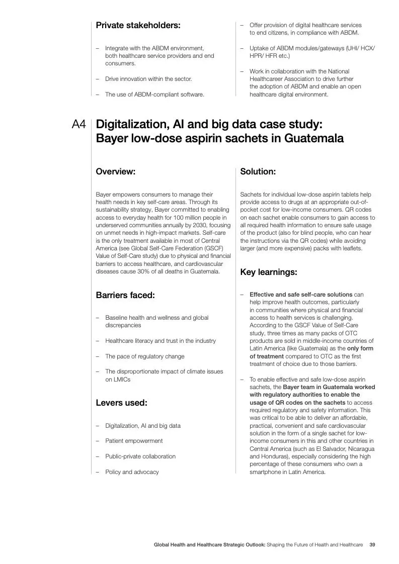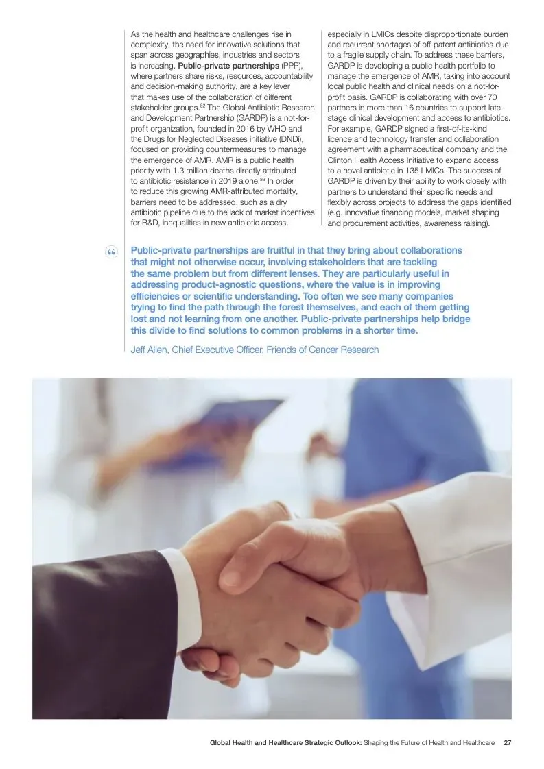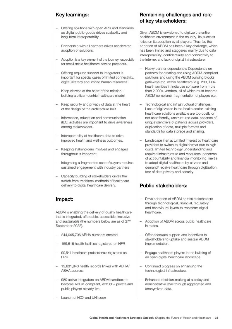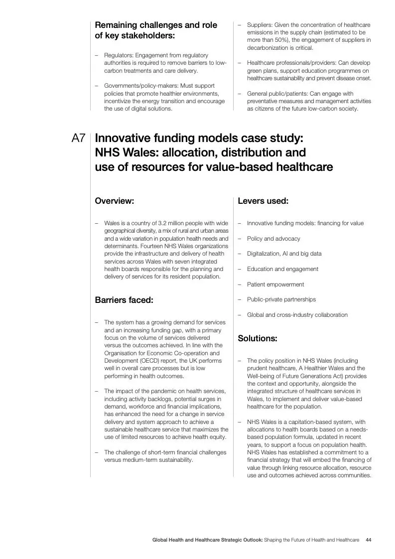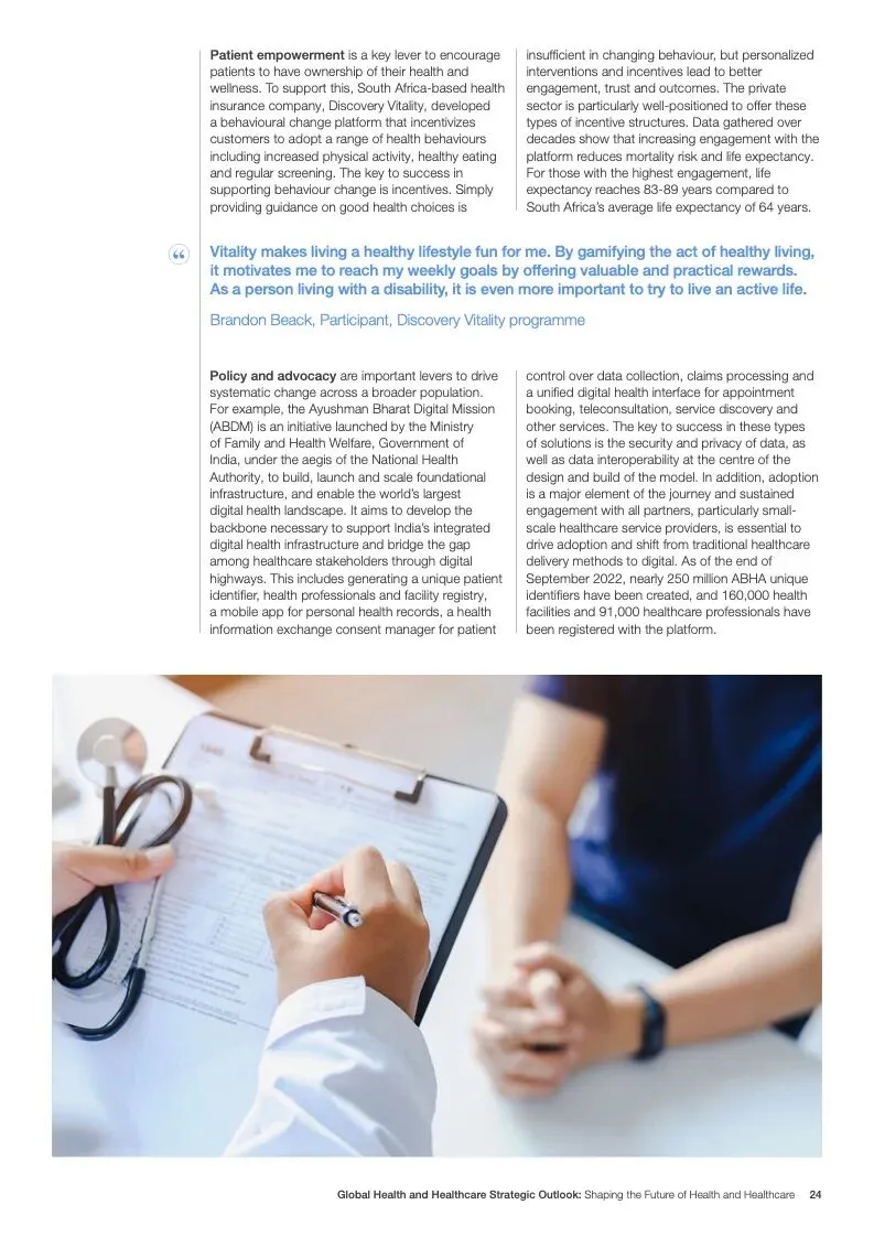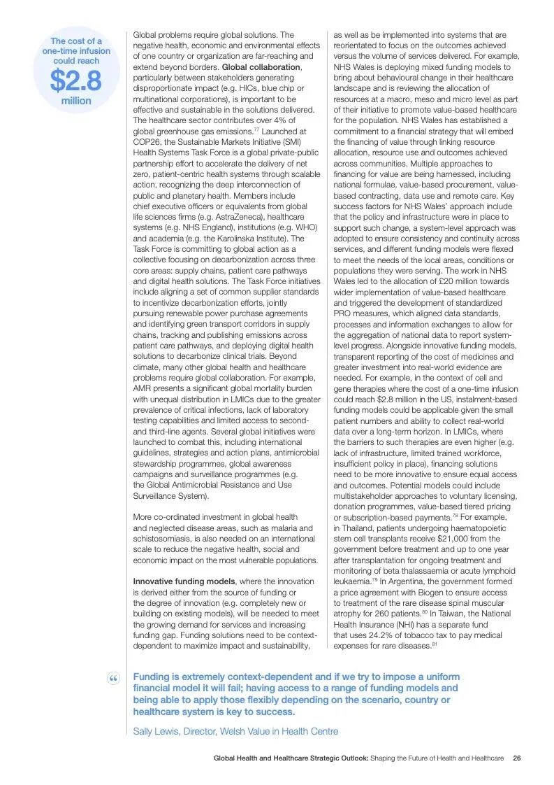 在努力实现这些战略的同时,公共和私营利益攸关方将遇到一些障碍。为了了解这些障碍的影响以及为解决这些障碍而部署的解决方案,报告对全球八个案例进行了研究。虽然每个案例研究都面临着微妙的障碍。对全球健康差距扩大的担忧十分突出。健康和医疗保健行业的创新速度受到监管改革步伐缓慢的限制。虽然在转变,但需要更大的协作来改变现状,从孤立的工作到基于共同目标的协作,这些共同目标提供的结果大于其各部分的总和。这些合作都不会产生长期的影响,除非在系统级别上驱动变化,而目前对系统级别的支持、激励或监控是有限的。