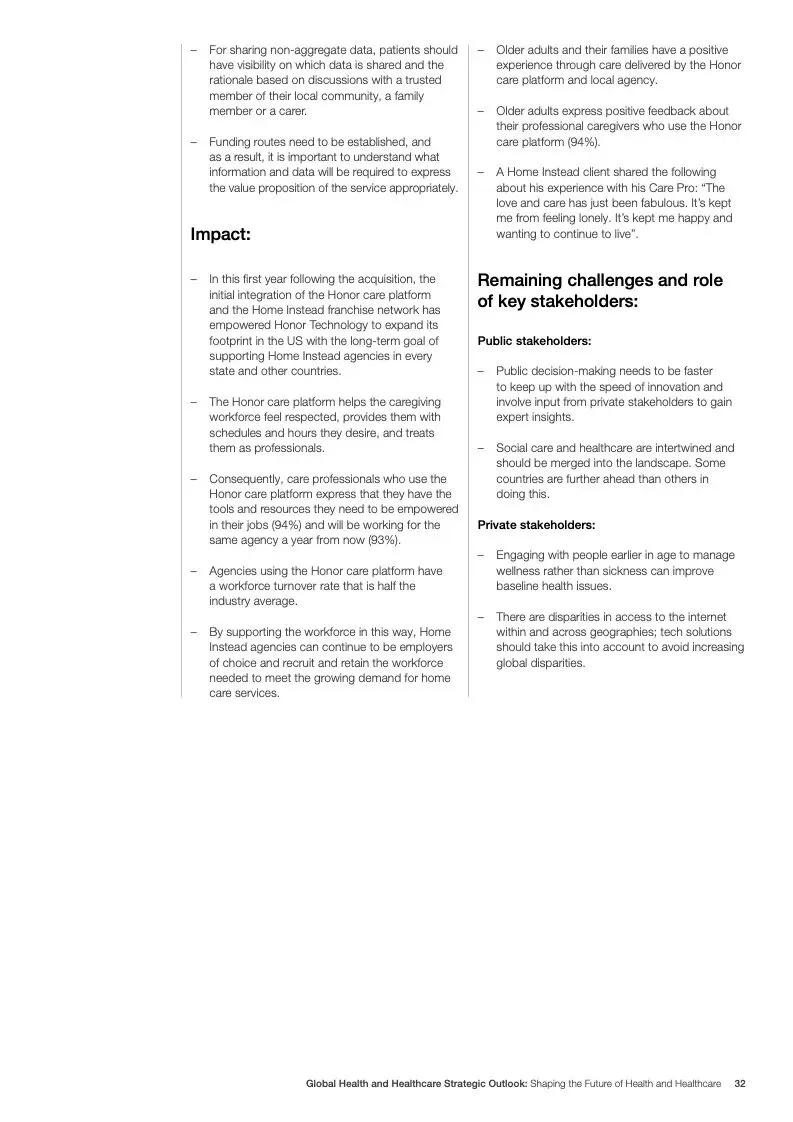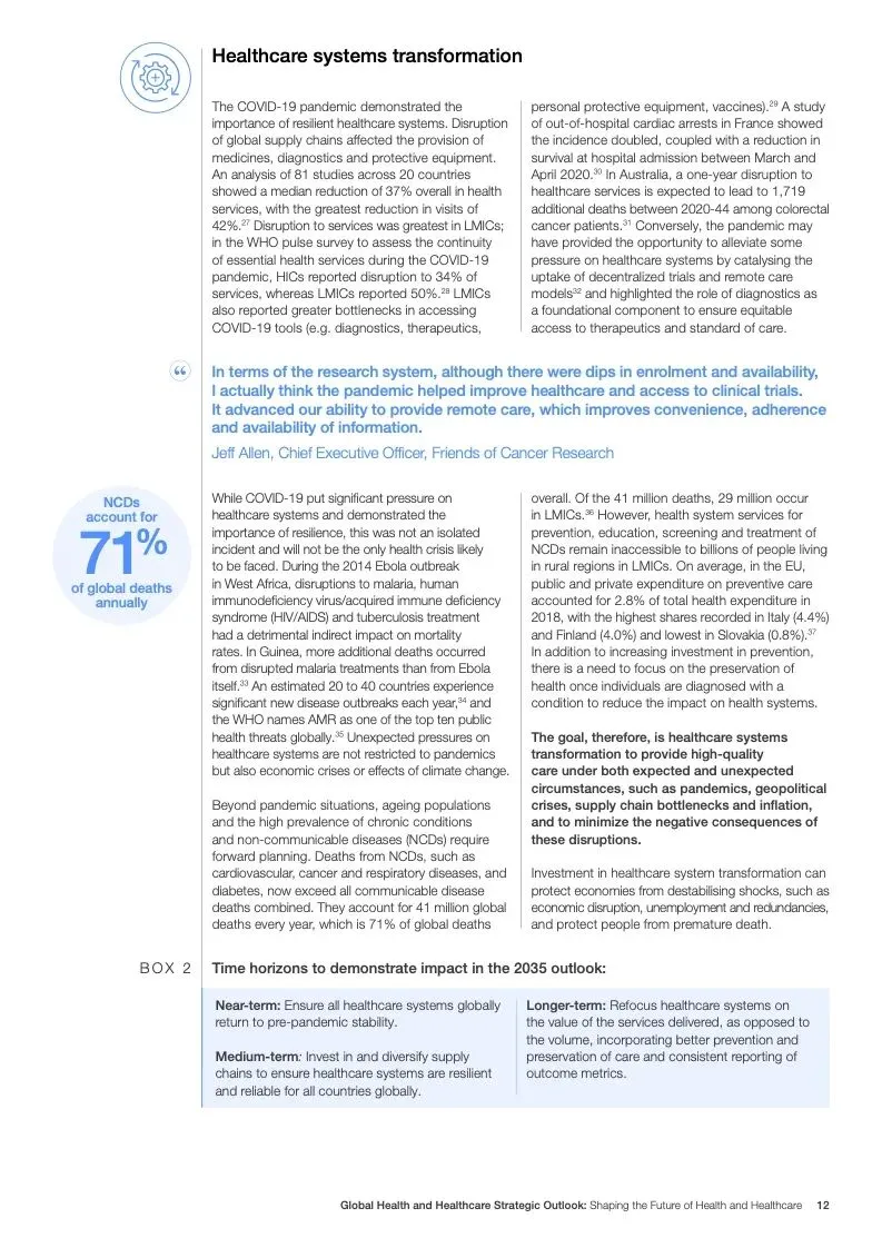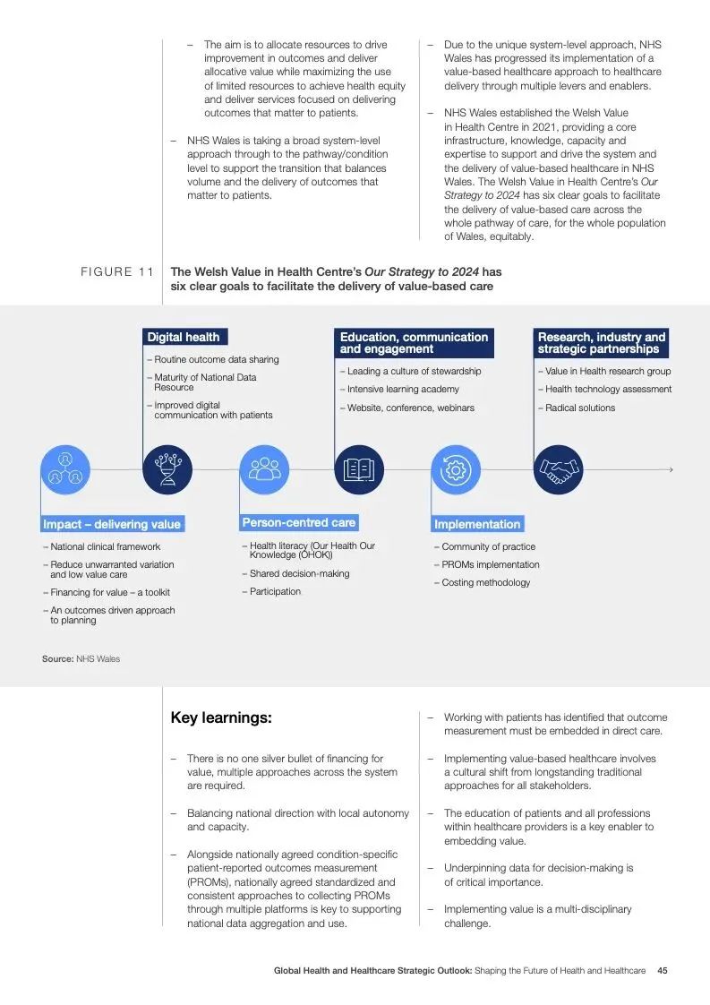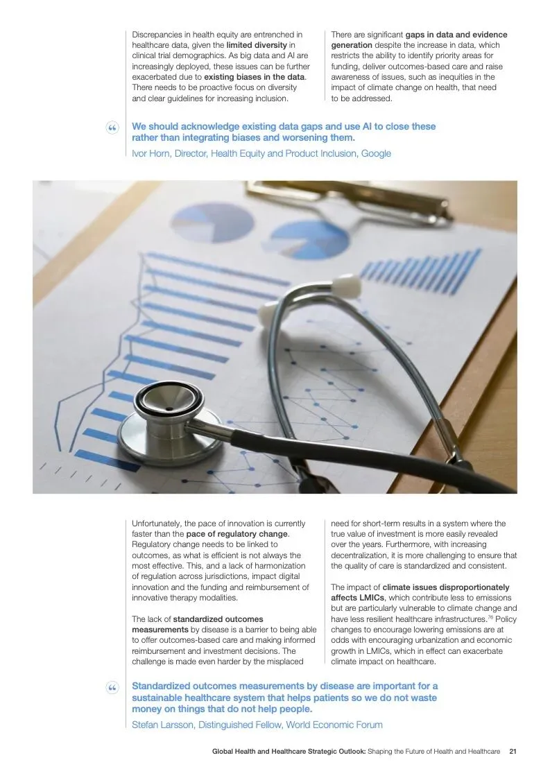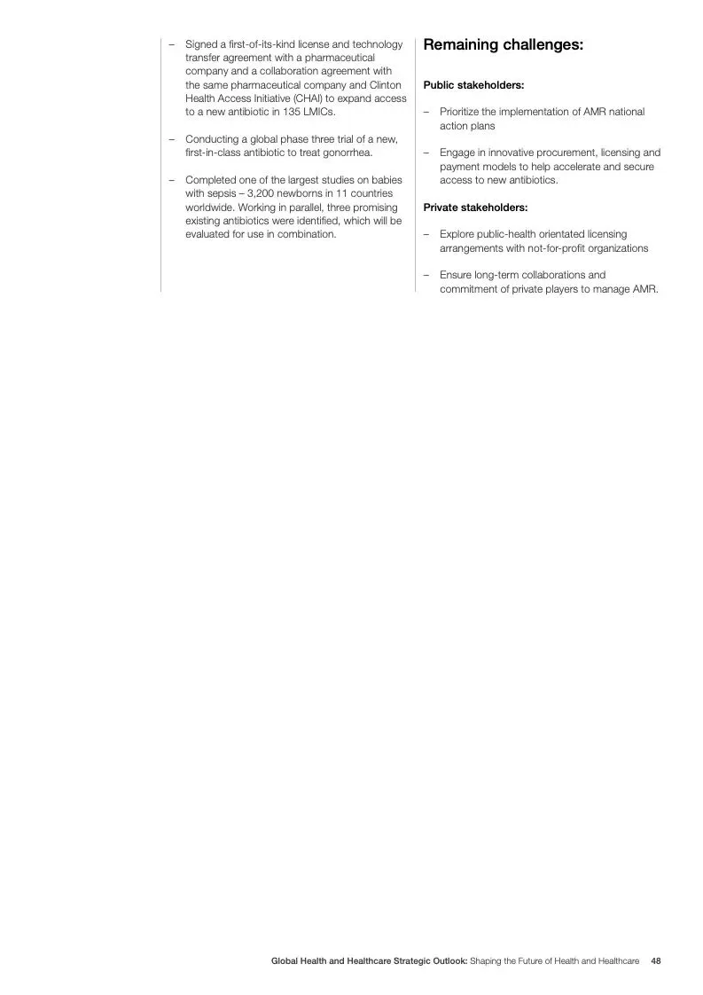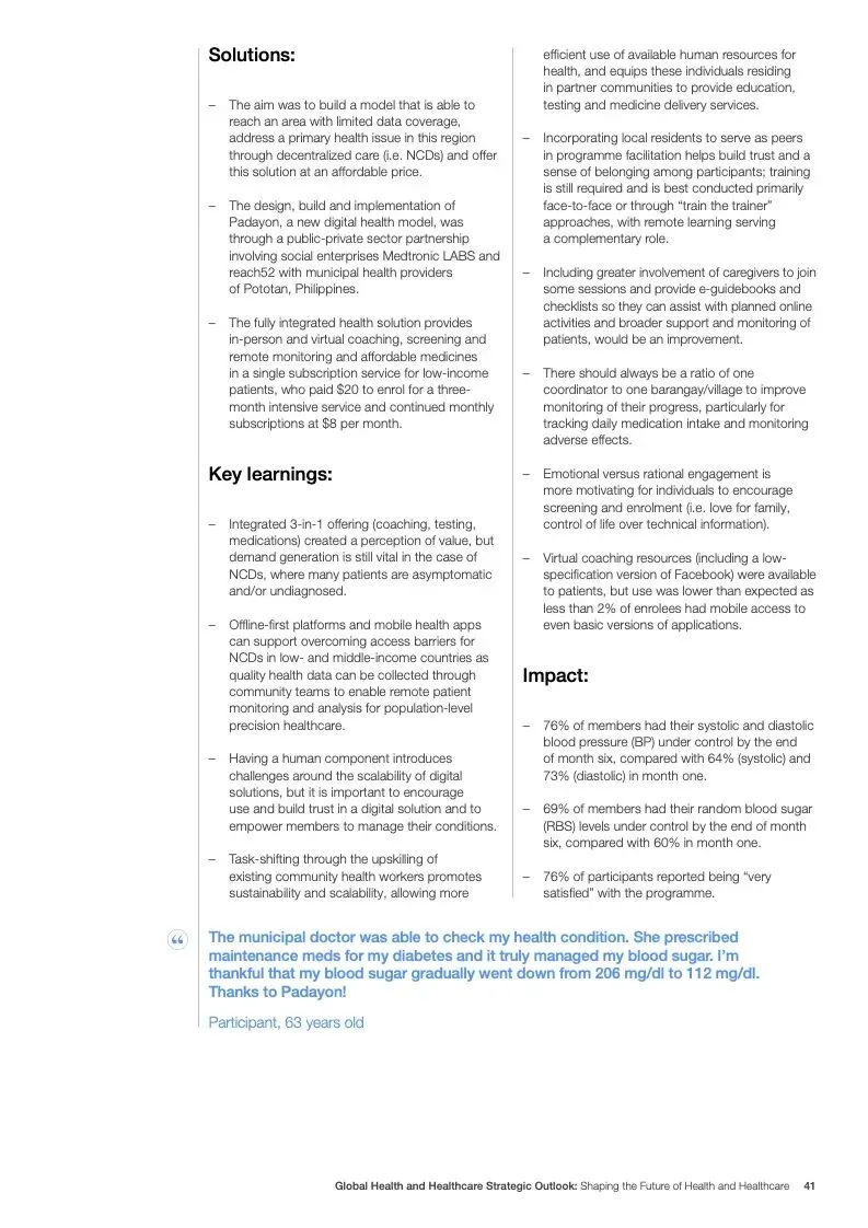 在努力实现这些战略的同时,公共和私营利益攸关方将遇到一些障碍。为了了解这些障碍的影响以及为解决这些障碍而部署的解决方案,报告对全球八个案例进行了研究。虽然每个案例研究都面临着微妙的障碍。对全球健康差距扩大的担忧十分突出。健康和医疗保健行业的创新速度受到监管改革步伐缓慢的限制。虽然在转变,但需要更大的协作来改变现状,从孤立的工作到基于共同目标的协作,这些共同目标提供的结果大于其各部分的总和。这些合作都不会产生长期的影响,除非在系统级别上驱动变化,而目前对系统级别的支持、激励或监控是有限的。