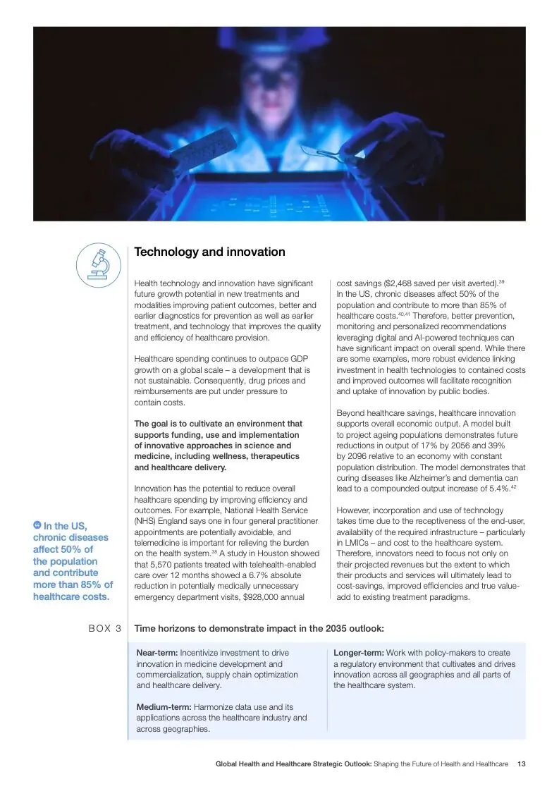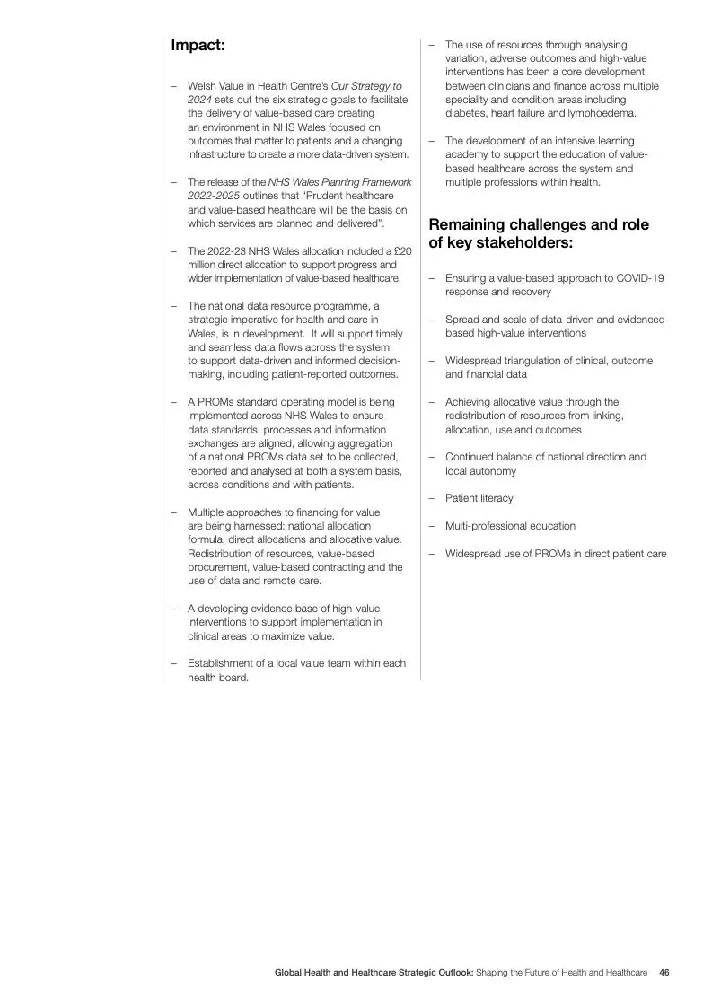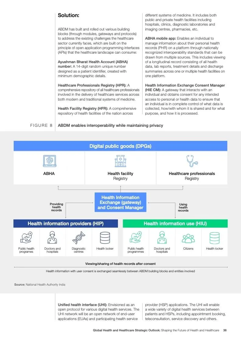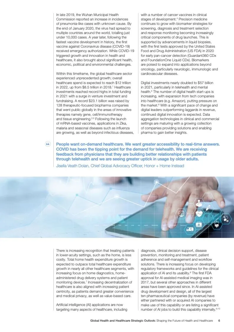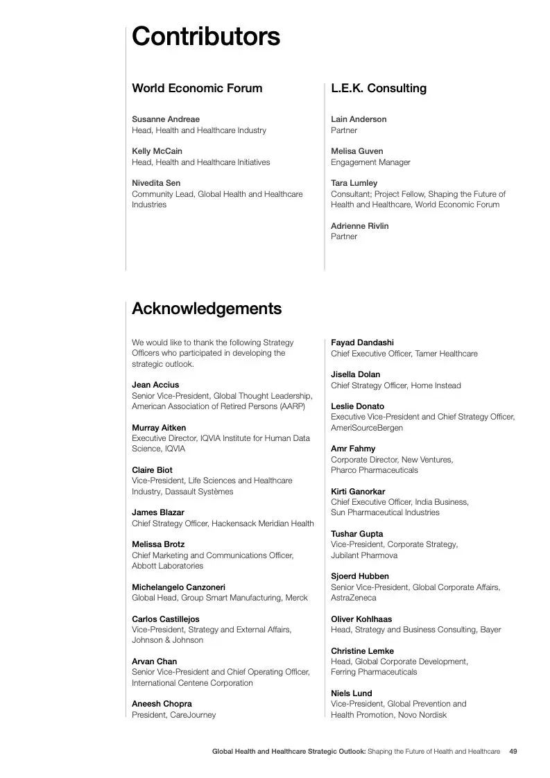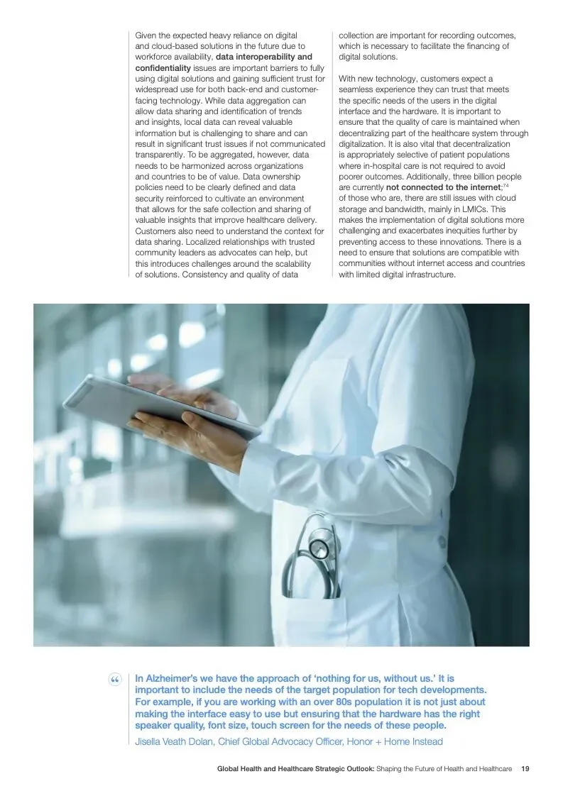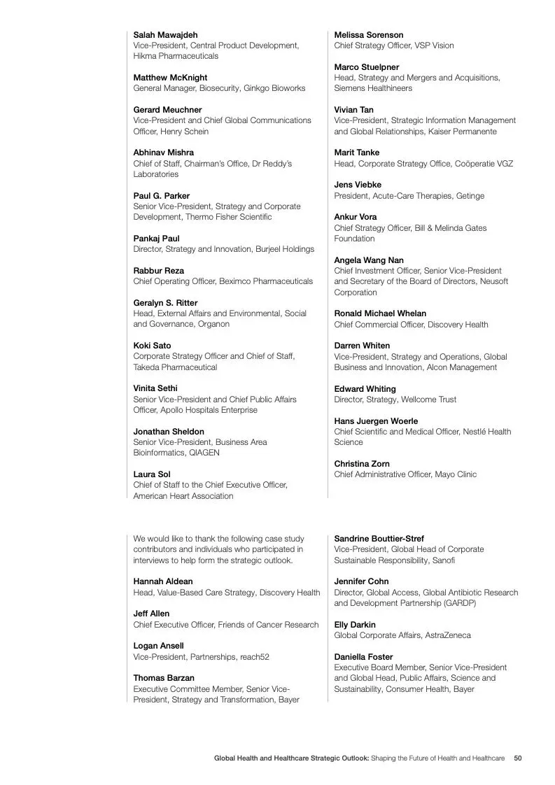 在努力实现这些战略的同时,公共和私营利益攸关方将遇到一些障碍。为了了解这些障碍的影响以及为解决这些障碍而部署的解决方案,报告对全球八个案例进行了研究。虽然每个案例研究都面临着微妙的障碍。对全球健康差距扩大的担忧十分突出。健康和医疗保健行业的创新速度受到监管改革步伐缓慢的限制。虽然在转变,但需要更大的协作来改变现状,从孤立的工作到基于共同目标的协作,这些共同目标提供的结果大于其各部分的总和。这些合作都不会产生长期的影响,除非在系统级别上驱动变化,而目前对系统级别的支持、激励或监控是有限的。