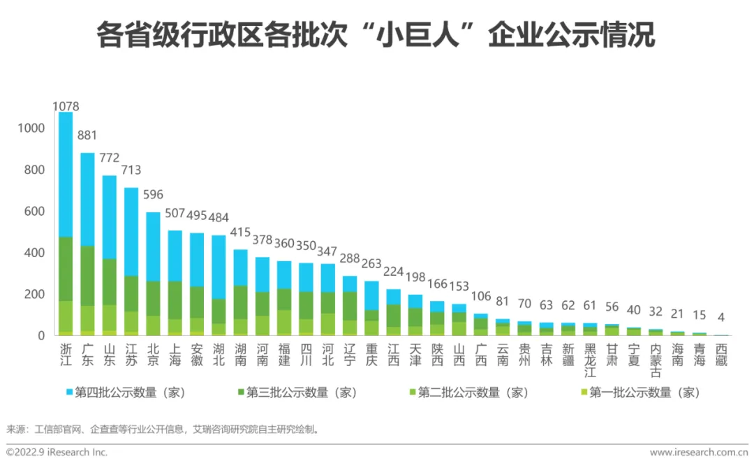 截至目前,工信部已公示9279家专精特新“小巨人”企业,其中超六成专精特新“小巨人”企业分布于制造业,但分批次来看制造业占比逐批下降,而科学研究和技术服务业及信息传输、软件和信息技术服务业“专精特新”企业发展趋势如日方升。专精特新“小巨人”企业地区分布东强西弱、阶梯递减的特征明显。