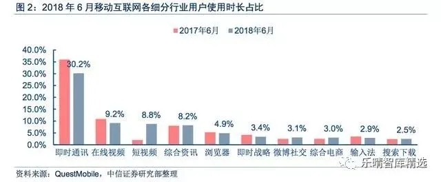 在18年上半年里,即时通讯和在线视频仍然牢牢把握流量入口位置,分别位列用户使用时长第一、二位,但是下降趋势也很明显,其中即时通讯从2017年上半年的36%降低至2018年上半年的30%,而在线视频从2017年上半年的11%降低至2018年上半年的9%,而短视频则刚好填补了这块降低的时长,从2017年上半年的2%增长至2018年上半年的9%。
