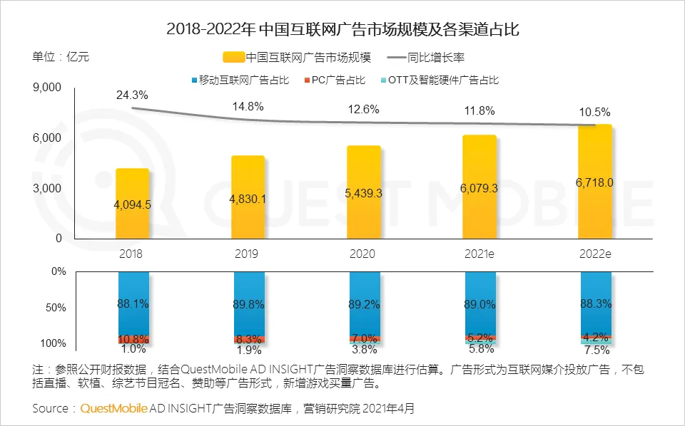 从互联网广告构成上看,2020年,移动互联网广告占比为89.2%,PC广告占比7%,OTT及智能硬件广告占比3.8%,三个部分中,PC广告占比持续下滑,从2018年的10.8%,一路跌到了7%;移动互联网广告占比,则是首次出现下滑,二者的份额,均被OTT及智能硬件广告吃掉了,逆转的态势已经形成,预计接下来几年,这个趋势还将持续。