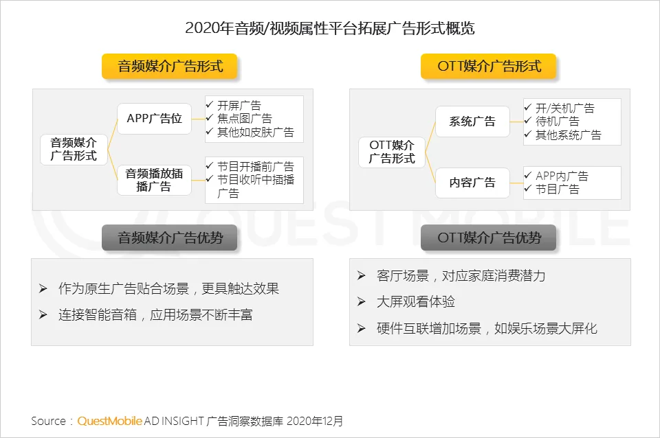 只要有流量的载体都在拓展广告变现模式,其中视频和购物属性的应用仍不断提高广告容量,此外,如游戏行业IAA+IAP(广告+内购)模式、音频行业音频广告和出行服务操作页面广告等形式,成为积极拓展广告变现模式的典型代表。