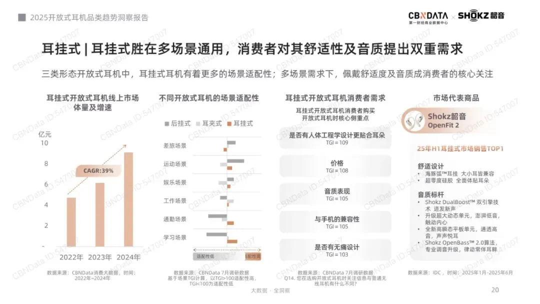 报告强调,开放式耳机市场已形成“线上主导销售、线下强化体验”的渠道格局。韶音凭借其全产品线布局策略,在高端开放式耳机市场占据主导地位,其产品如OpenFit 2、OpenDots ONE和OpenRun Pro 2在2025年上半年分别登顶各自品类的销额TOP1或TOP2。韶音的成功源于对用户“多场景使用”痛点的深度洞察与产品落地,实现了“全场景覆盖”。