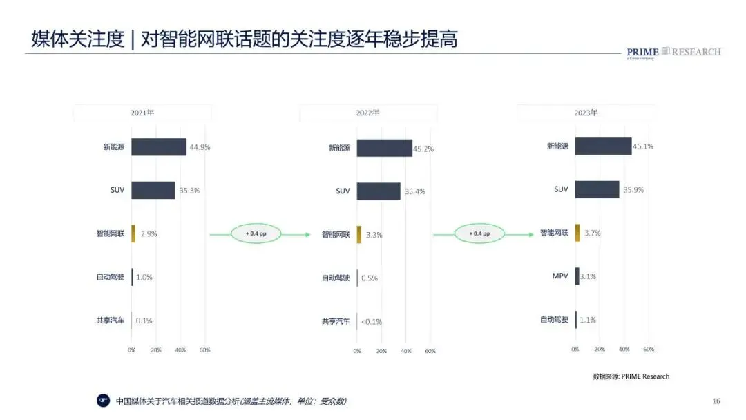 在过去的一年中,“新能源”与“SUV”依然是最受国内媒体关注的话题,这一趋势已经保持了4年,且新能源的领先优势也正在不断扩大。而围绕智能网联的话题也依然可以引发一部分的讨论。MPV车型在过去的2023年备受关注,其关注度甚至直接超越了在榜上多年的自动驾驶。