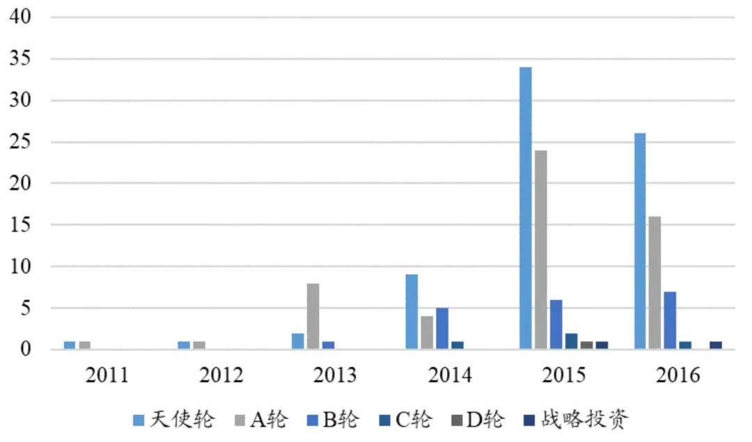 2015年行业的融资次数提升至68笔,融资总额达到54.06亿元,大多数集中在天使轮和A轮相对早期的环节,相较于2014年的19笔融资、6.18亿元融资总额均明显提升。