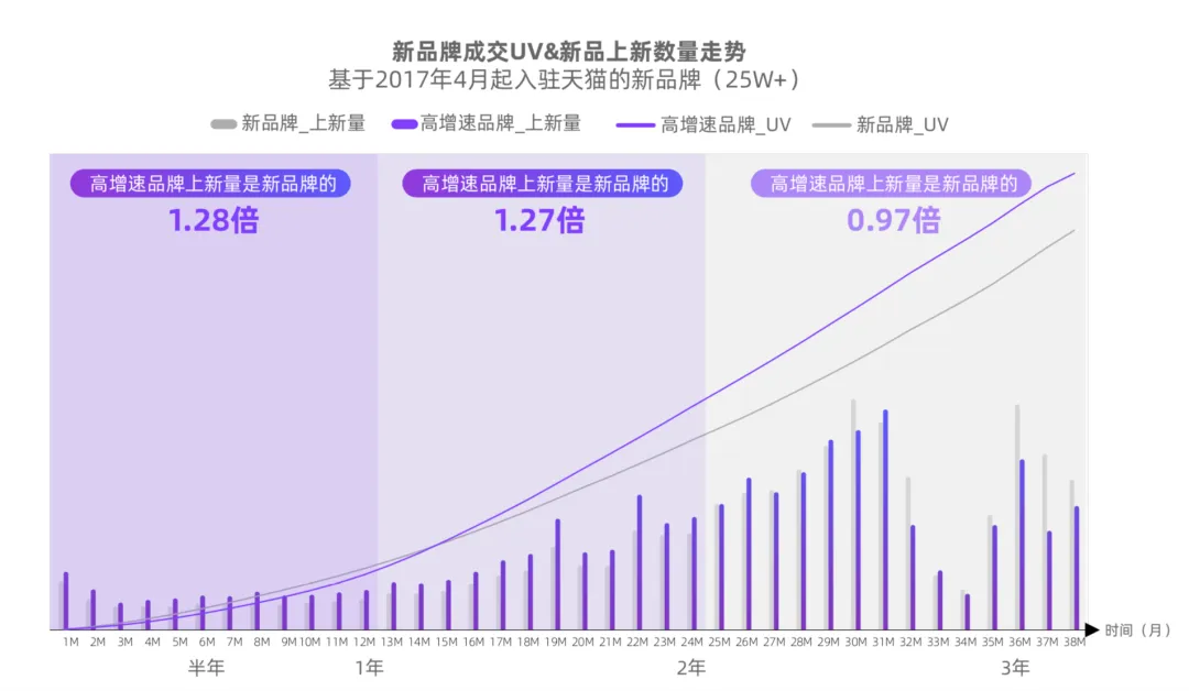 第一点,新品牌营销的洞察中提到, 2019年是新品牌爆发元年,疫情过后新品牌风潮进一步上涨,天猫新品牌个数一度达到了25W+,虽然最终存活下来的不到50%,但是新品牌正在实现巨大的利润收益。究其原因,新品牌的产品力、创新力、营销力,是高增速品牌们品牌力的主要因素。