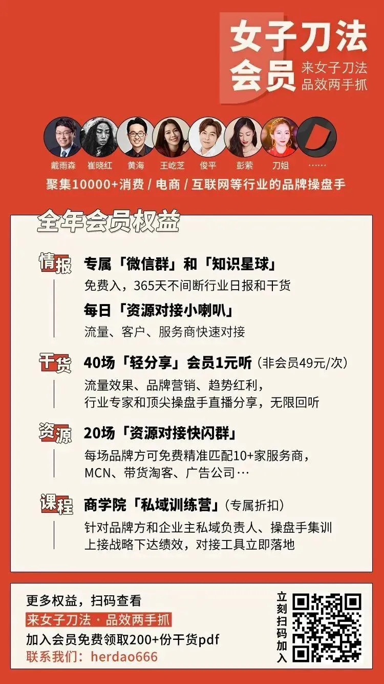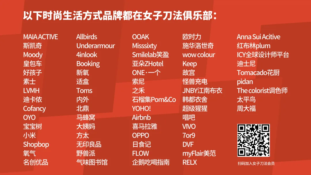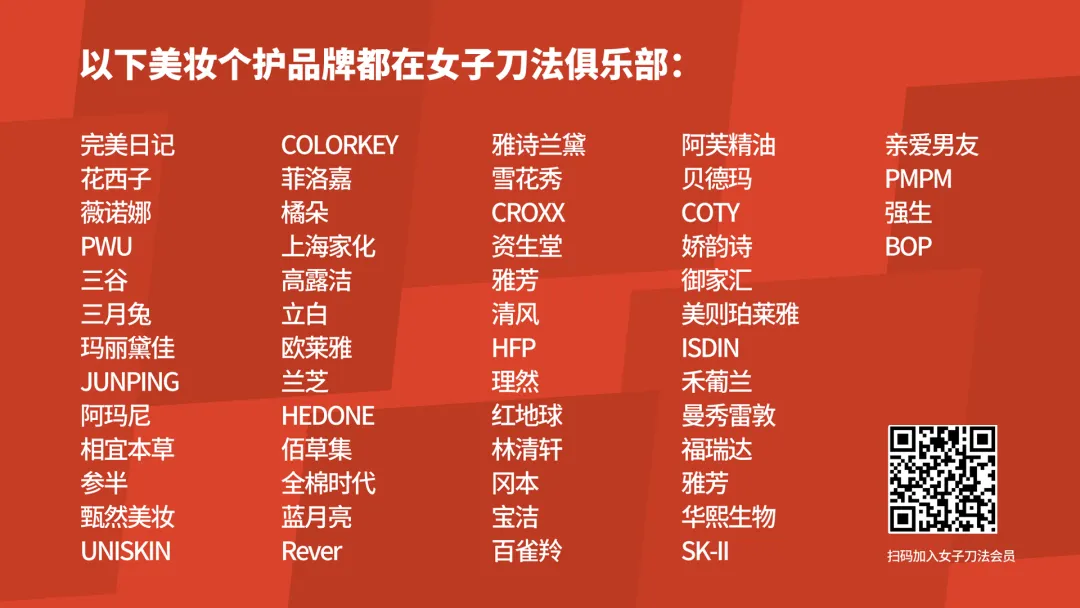 越来越多的消费品牌都在重新思考营销和品牌理论,并且亲在下场在互联网时代中实战检测,而在风起云涌快速变化的流量时代,我们更需要行业之间的信息交流,资源协助和认知升级,很高兴越来越多的消费品公司加入到女子刀法。