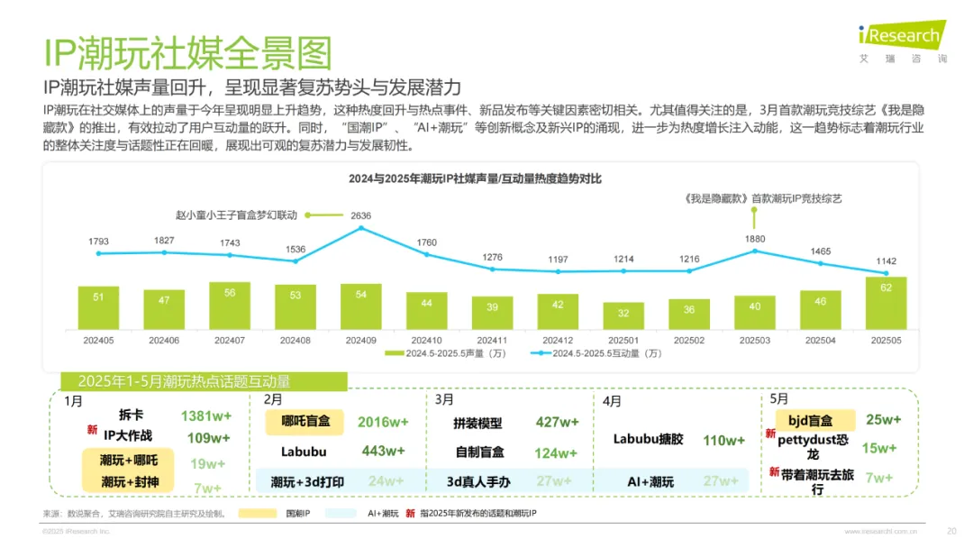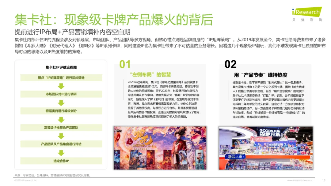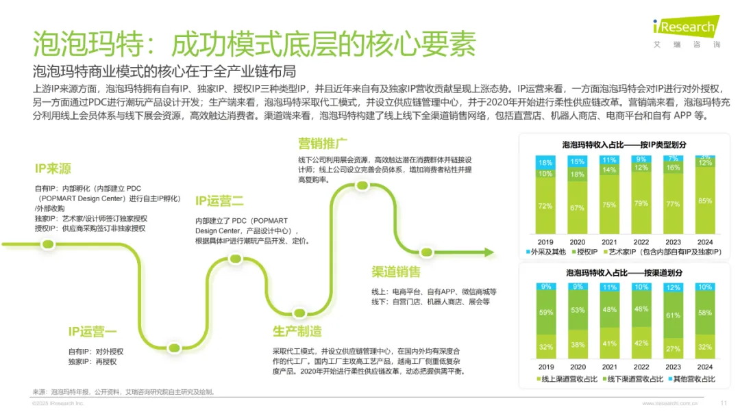 增长相当稳健,2024年规模摸到678亿,前四年年均增速13.8%,未来几年预计还能保持11.3%的节奏,2027年就能迈过千亿门槛。驱动力量来自全链条的发力:上游IP商业化越来越成熟,泡泡玛特的PDC中心能高效孵化原创IP,LABUBU就是这么火遍全球的,集卡社签约《哪吒2》做卡牌更是一抢而空;中游玩法和供应链不断创新,盲盒之外,拆卡直播一年搜索量涨了近4倍,泡泡玛特的柔性供应链还能精准控成本;下游渠道也越来越广,小红书种草、抖音拆卡直播,线下机器人商店和主题店遍地开花,触达的人越来越多。