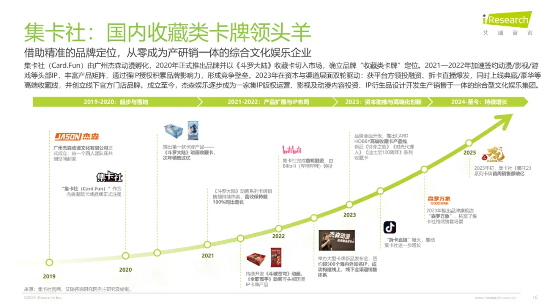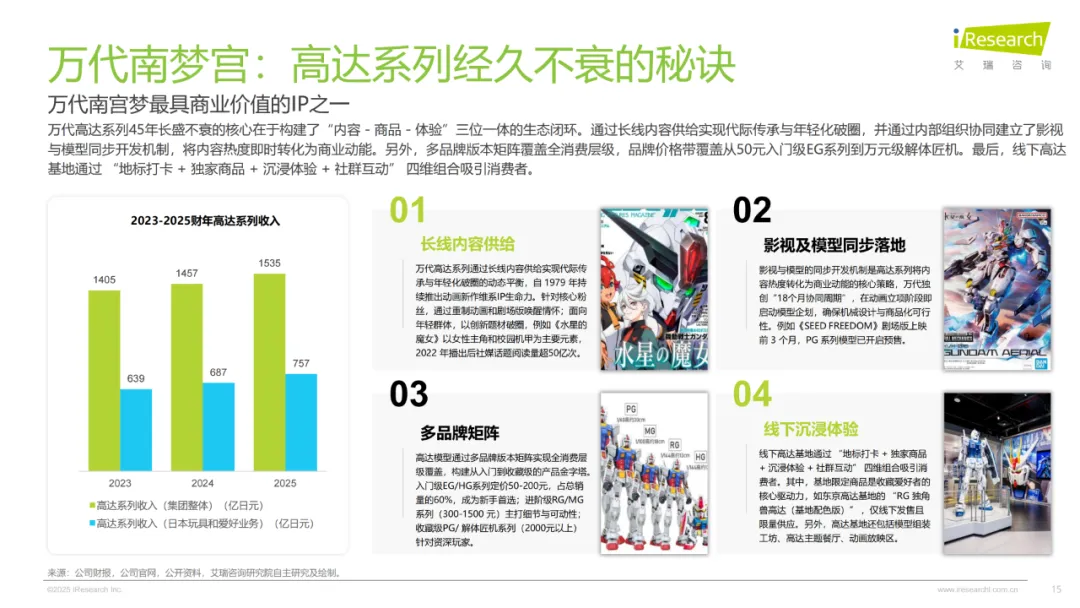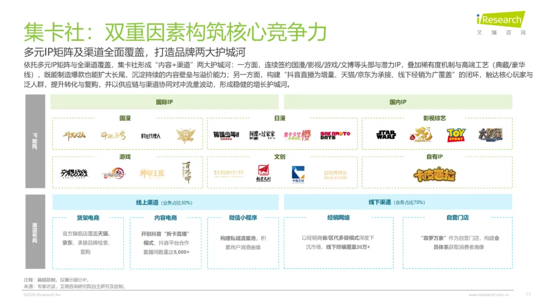 三者的重心完全不一样。泡泡玛特死磕自有IP和全球化,2024年艺术家IP收入占了85%,LABUBU不仅国内畅销,泰国门店新品当天售罄,还靠全产业链布局和STS展会链接设计师,从单品爆火延伸出完整生态。万代南梦宫主打“IP轴战略”,打破部门墙让一个IP多场景落地,比如《龙珠》覆盖动画、游戏、盲盒,高达更是做成“内容-商品-体验”的闭环,影视和模型同步开发,能覆盖所有消费层级。集卡社则深耕收藏卡牌赛道,靠《斗罗大陆》《哪吒2》这些头部IP授权破局,抖音5000多家合作直播间的拆卡直播拉爆线上销量,线下20多万终端里七成在下沉市场,走的是IP快速变现、产品高频迭代的路子。