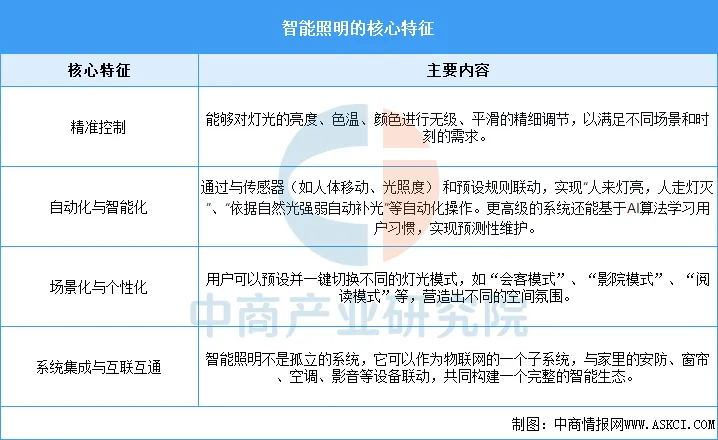 智能照明,是指利用物联网、云计算、人工智能等先进技术,让照明系统具备环境感知、智能分析、自动执行和持续优化能力,从而提供更节能、更舒适、更高效且可个性化定制的光环境解决方案。智能照明颠覆了传统照明“一开一关”的单一模式,其核心特征可以概括为以下四点: