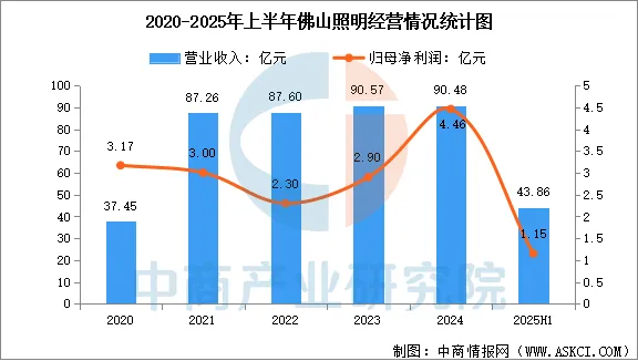 2025年上半年,佛山照明营业收入为43.86亿元,同比下降8.34%,归母净利润为1.15亿元,同比下降40.18%。上半年,公司通用照明产品收入15.56亿元,占比35.47%,LED封装及组件产品收入11.39亿元,占比25.97%,车灯产品收入10.14亿元,占比23.11%。
