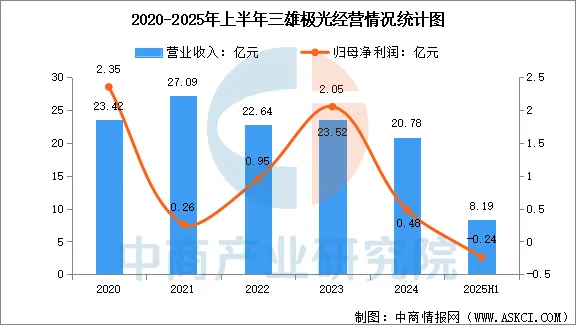 2025年上半年,三雄极光营业收入为8.19亿元,同比下降16.49%,归母净利润亏损2366.42万元,同比下降156.41%。上半年,公司照明灯具收入7.121亿元,占比86.91%,照明控制类及其他收入8912万元,占比10.88%。