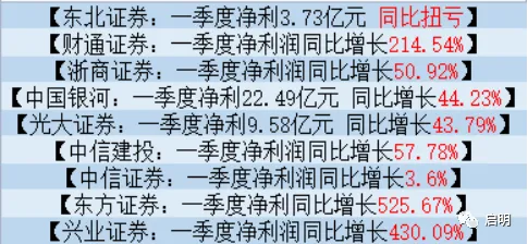 高增长赛道一季报分析之券商赛道最近我们看到有一个赛道,业绩出现了比较明显的增长,比如券商里面的东北证券一季度盈利是3.7亿,同比扭亏财通证券增长214%,浙商证券增长50%,中国银河增长44%,光大证券增长43%,中信建投增长57%,中信证券增长3.6%,绝对龙头增长的少一点,东方证券500%,兴业证券430%