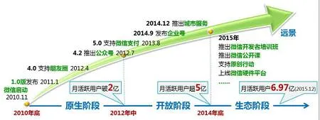 微信五年的发展历程经历了三个发展阶段:原生阶段、开放阶段、生态阶段。