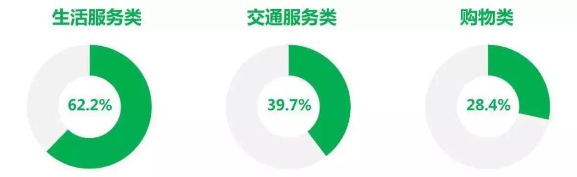 在交通方面,通过微信钱包提供滴滴打车、火车票、机票等服务,用户使用率近40%;