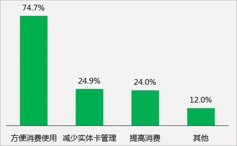 据调查,卡包推广仅一年,用户使用率已达20%,收获了良好的口碑,75%的使用者认为其方便消费使用,25%认为减少实体卡管理,24%提高了消费。