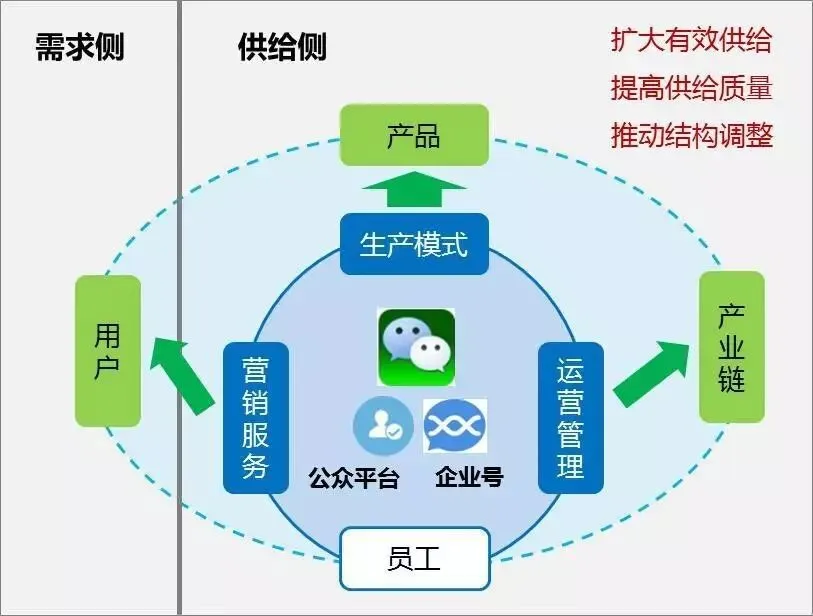 微信作为“互联网元器件”,高效连接、深度融入产业全价值链,以公众号、企业号为功能集成、能力开放的主要平台载体,深化改造提升企业、组织等营销服务、运营管理、创业创新等全流程,推动效率提升、成本降低、生产方式与组织模式变革,加快向高水平供需平衡跃升,积极助力了供给侧结构性改革。