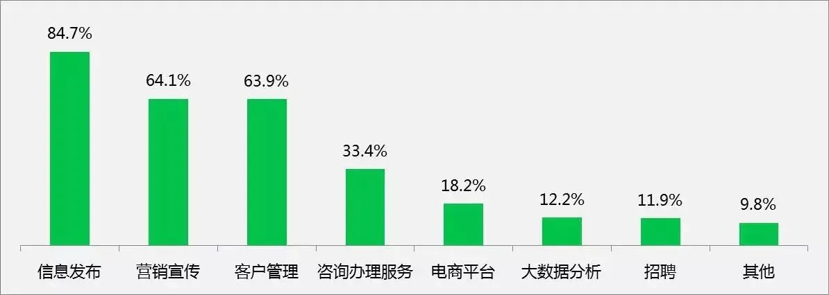 据调查,经营者使用公众号主要用于信息发布(84.7%)、营销宣传(64.1%)、客户管理(63.9%)、业务咨询/办理/服务(33.4%)等方面。