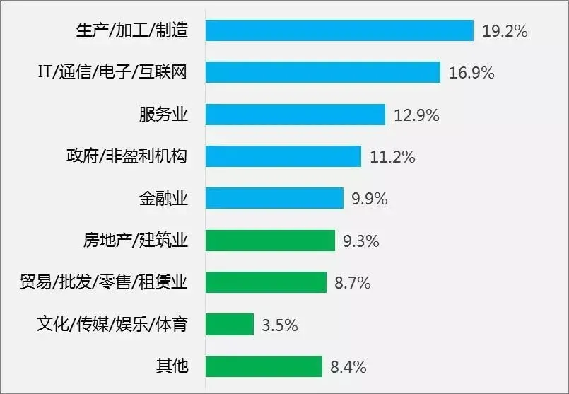 据调查,企业号使用者覆盖各行业各类主体,前五位分别为生产/加工/制造业(19.2%)、IT/通信/互联网(16.9%)、服务业(12.9%)、政府/非营利组织(11.2%)、金融业(9.9%)。
