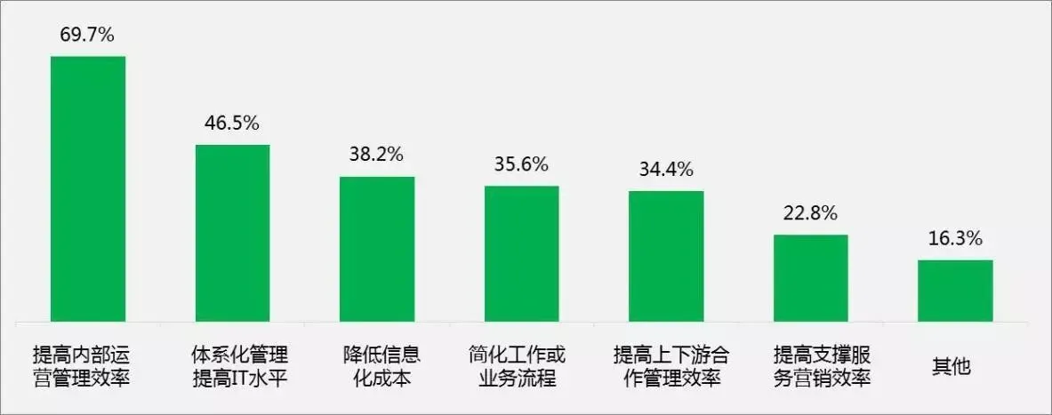 通过使用者调研,企业号的主要影响功效体现在:提高企业与组织的信息化水平(46.5%),提高内部运营管理效率(69.7%)、上下游合作管理效率(34.4%)、支撑营销服务效率(22.8%),以及降低信息化成本(38.2%)。