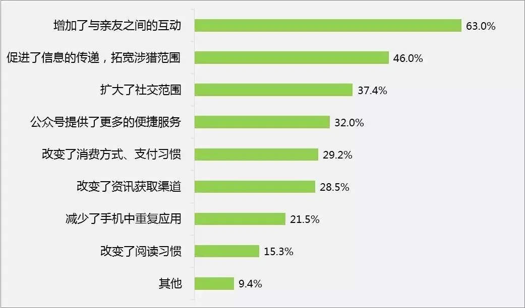 据调查,46%的用户认为微信促进了信息传递,拓宽涉猎范围;28%的用户因微信改变了资讯获取渠道。在所有通过手机获取资讯的方式中,38.1%的用户选择了微信,高居榜首,领先各类新闻客户端10个百分点。