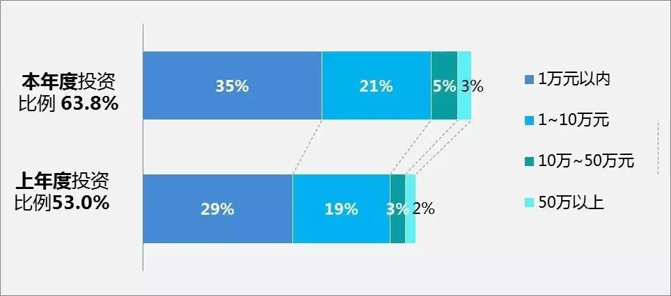 有63.8%的运营者对公众号高级开发和运营做了投资,近30%的投资额超过1万元,较上年度调查投资额度有较大增长,运营者对公众平台的价值认同感明显提升。