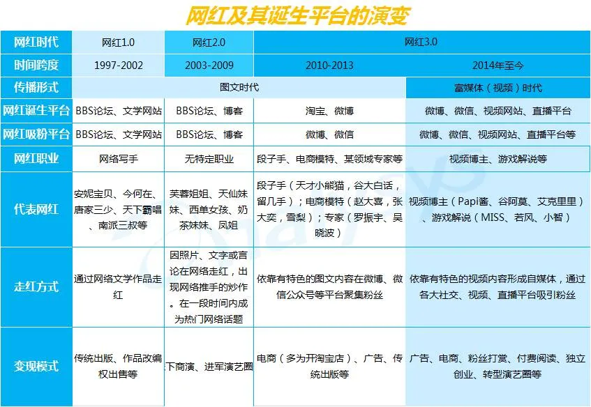 随着中国网络环境及互联网传播形式的演变,网红经历了从1.0向2.0、3.0时代的演变。
