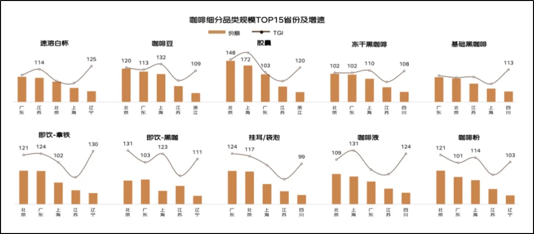 从产品趋势上,数据发现在发展和培育新品牌的同时,云南咖啡可以深耕咖啡豆、基础黑咖,同时加大冻干黑咖啡、即饮黑咖的布局,来满足消费者的多元需求。四川、湖北、陕西等地咖啡消费增速快 上海偏好品质 北京偏好便捷随着咖啡消费迈向日常化,消费者对咖啡的需求使得咖啡季节化趋势明显,其中春天和冬天喜欢喝挂耳咖啡,夏天咖啡液更受欢迎。数据显示,21-45岁的一、二线城市已婚用户仍是咖啡消费的主流人群,咖啡在三线及以下城市的年轻人中也掀起潮流。不同年龄段的消费者对于咖啡品类的选择也各不相同。用户调研数据显示,年龄较高的用户更喜欢速溶和即饮咖啡,高线城市30岁以下用户更爱喝即饮咖啡,而年轻消费者更偏好速溶黑杯。