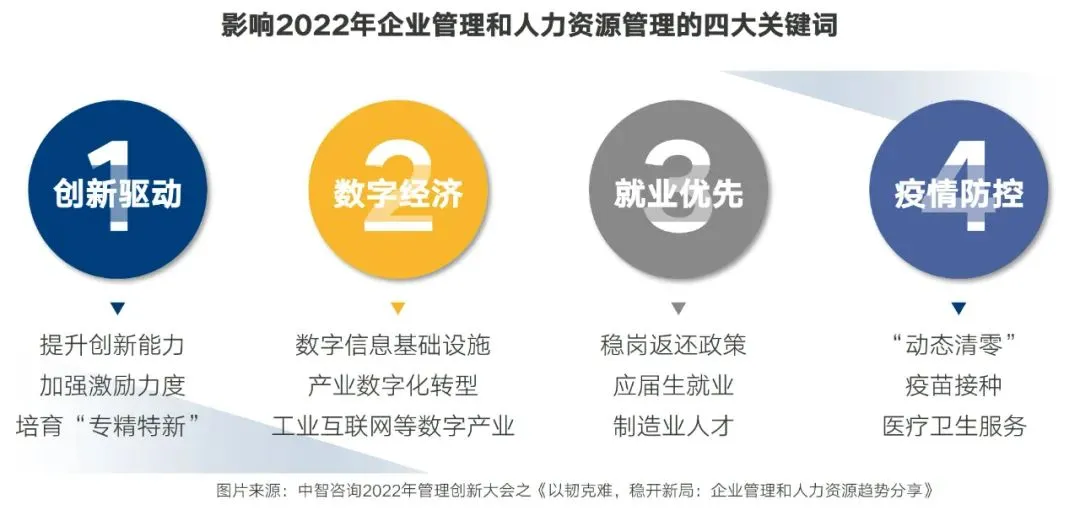 本次大会以《以韧克难,稳开新局:企业管理和人力资源趋势分享》主题演讲开场,演讲中对宏观市场做了趋势解读,并总结出影响2022企业管理的四大关键词:科技创新、数字经济,稳岗就业、疫情防控。
