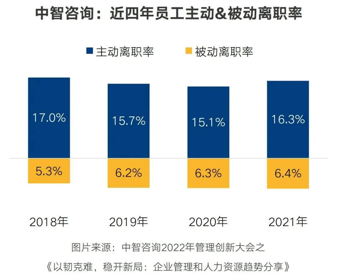 2021年人才流动相对活跃,员工主动离职率为16.3%。2022年上半年人才流动趋于稳定,员工对于主动跳槽的态度更偏谨慎,求职就业的态度以稳为主,并未出现往年的“金三银四”的火热状况。近期疫情对于企业的经营活动带来一定阻碍,企业招聘和人员流动的节奏有所放缓。
