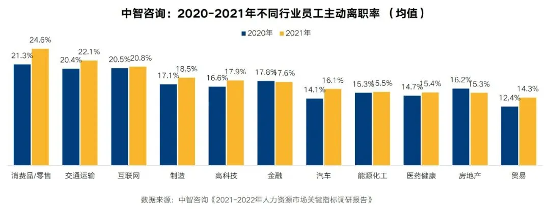 中智咨询调研结果显示,大部分行业预计离职率基本和去年同期持平,其中销售贸易/消费品、高科技行业预计人员主动离职率上升,而互联网、能源化工行业预计人员主动离职率有所下降。