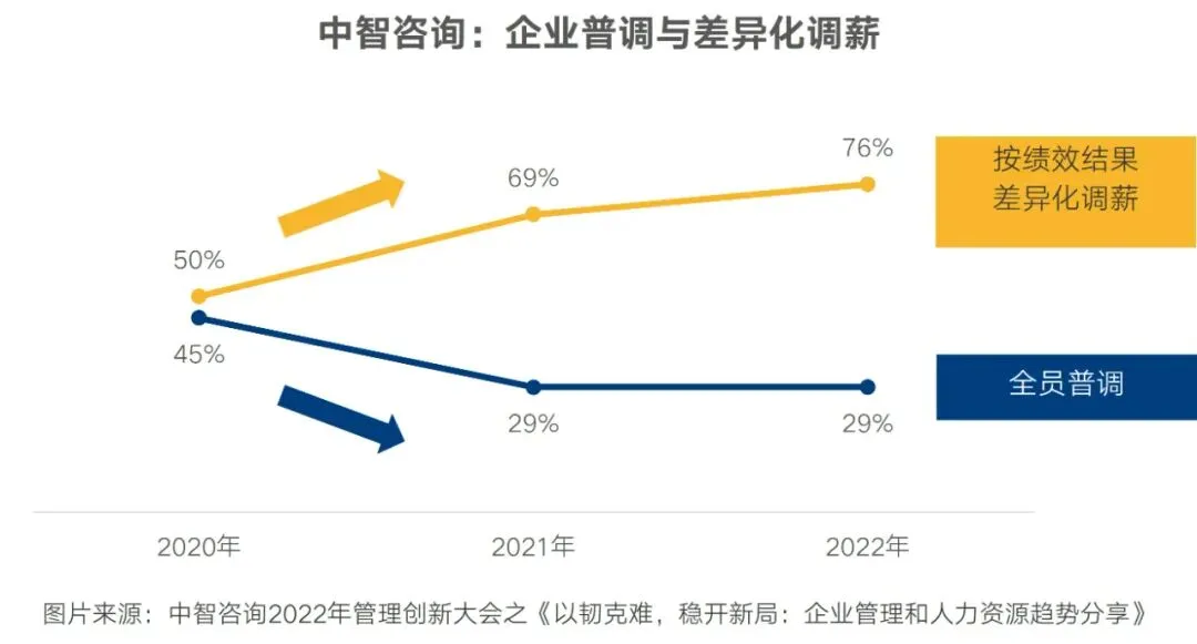 中智咨询调研结果显示,2020-2022年间,在有调薪计划的企业中,按绩效结果差异化调薪的企业占比由50%快速上升至76%,相比之下选择进行全员普调的企业则从45%下降至29%。