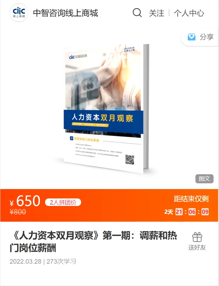 25个典型城市调薪率、不同性质企业调薪率、行业及不同层级人员调薪率、9大行业热门岗位薪酬水平,扫描二维码购买中智咨询《人力资本双月观察》第一期:调薪和热门岗位薪酬水平。(限时拼团特惠,仅剩两天!可直接参与拼团,我们帮您完成拼团)