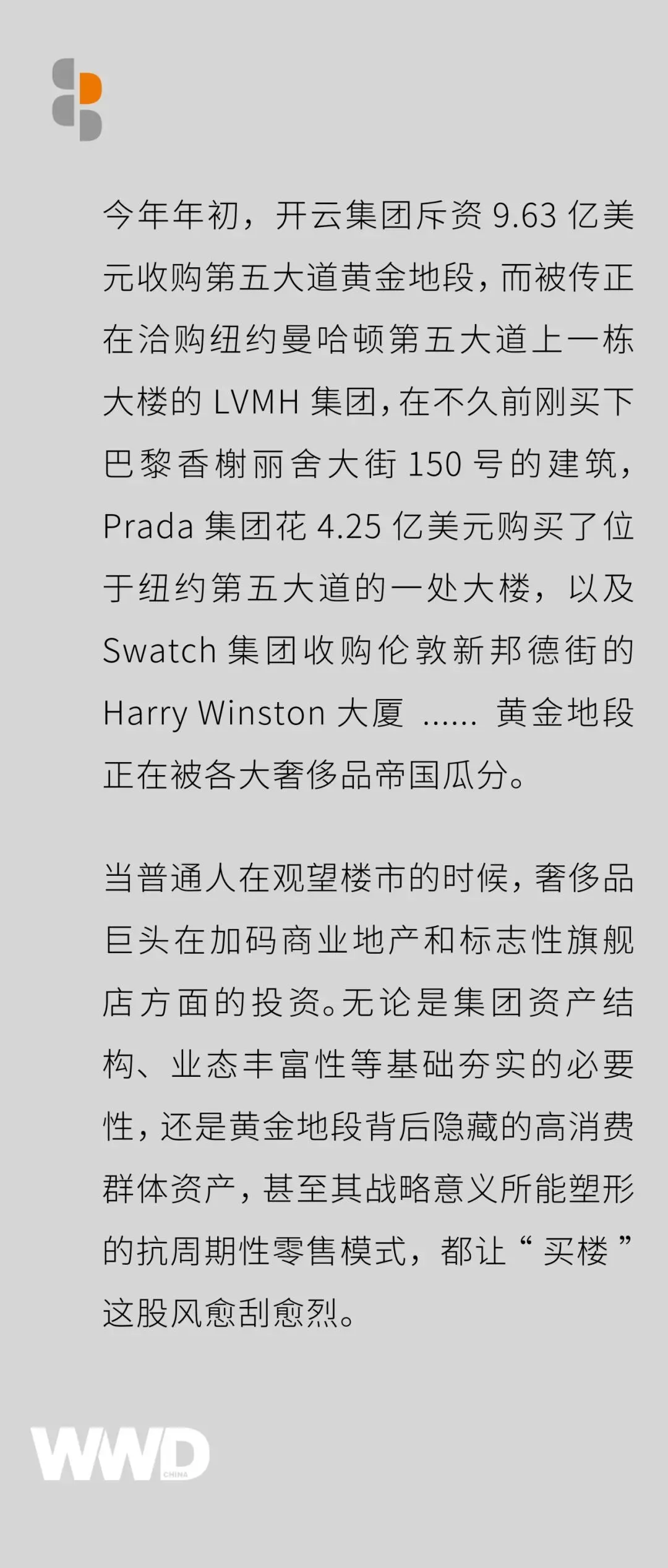 不确定性犹在、低增长常态已至,黄金地段的卡位战不仅关乎奢侈品巨头“排面比拼”,更是稳定高消费势能、塑造独特零售模式、提振产业信心的有效手段。而以更长周期的视角去看,这些既在当下具有实际用途,又在未来持续实现附加收益,还能保值升值的投资标的,无疑正处于价值洼地。WWD